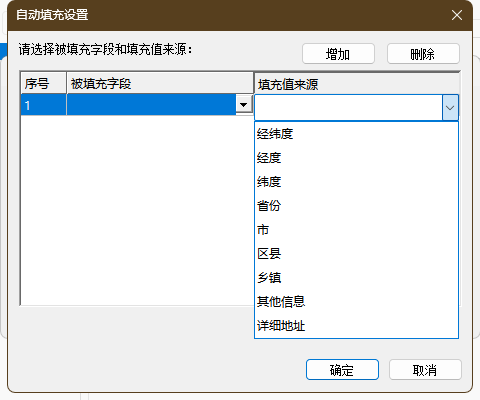 - 其中控件高级设置中允许配置控件自动填充功能,定位控件自动填充功能与一般选项类控件不同,其填充值来源字段内容是定位信息相关的内容,如下图所示。