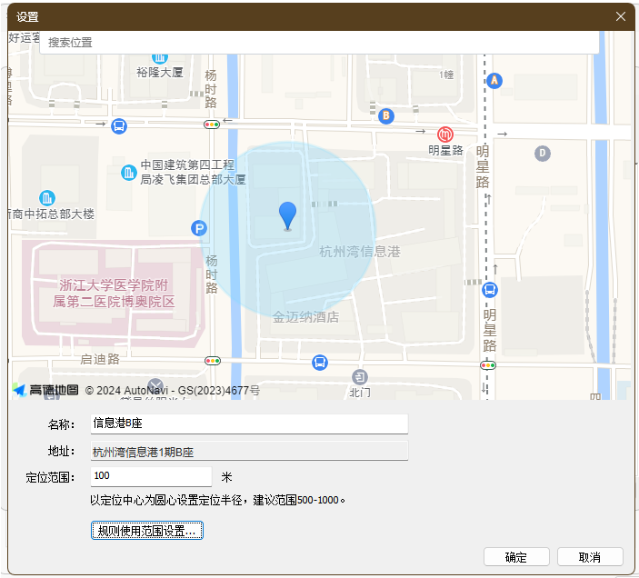 - 定位范围:允许保存的地点范围,配置相应的数值后可以在地图上实时看到以定位中心点为半径覆盖的区域。
