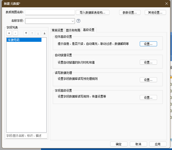 - 支持控件高级设置、校验设置、自动赋值设置和字段高级设置等,详细配置说明请查阅章节 元数据>字段高级设置