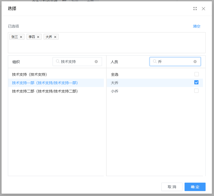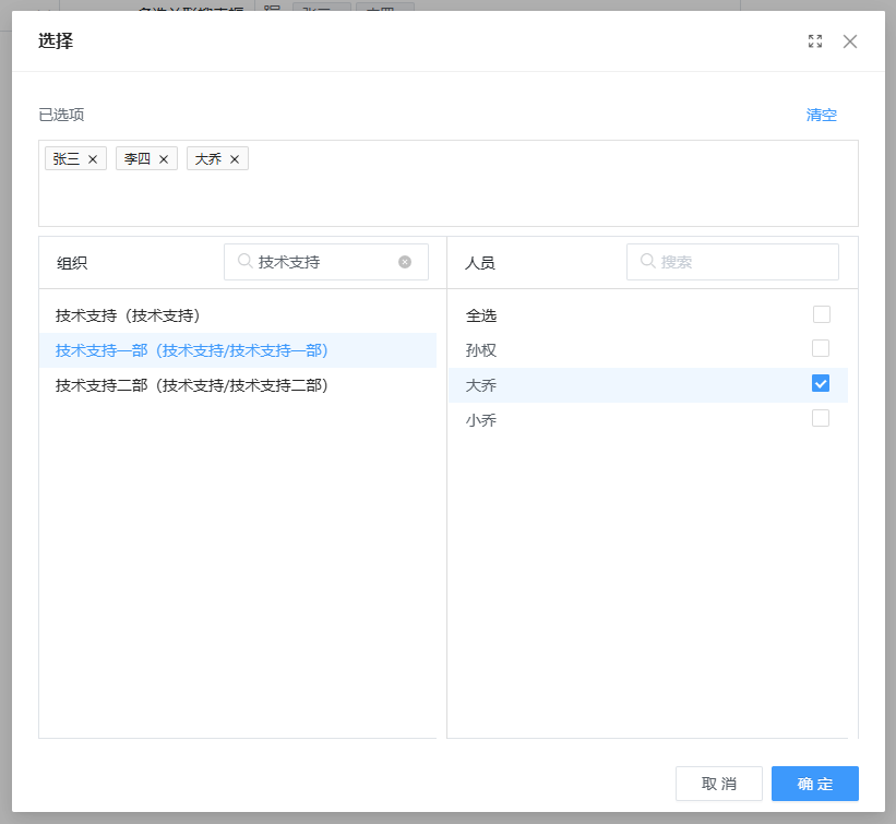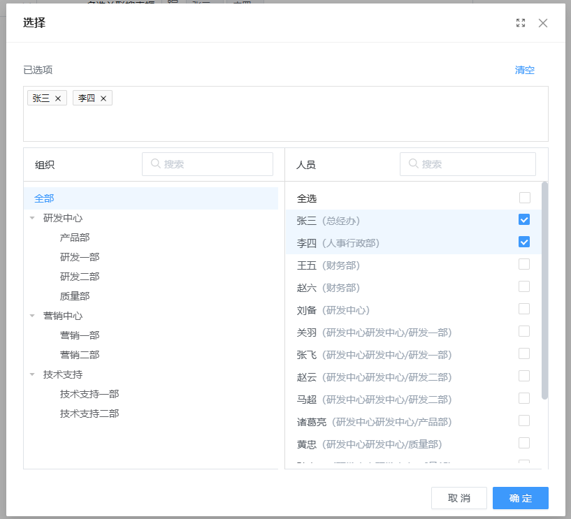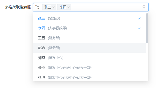 多选关联搜索框控件与单选关联搜索框使用场景类似,可以实现通过某个有关联的数据源对另一个数据进行关联搜索和过滤,例如人员信息中包含部门信息,可以在人员选择时通过部门对人员信息进行快速过滤和查找。