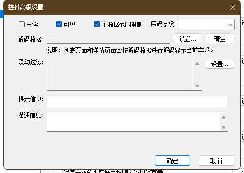 - 支持控件高级设置、校验设置、自动赋值设置和字段高级设置等,其中在控件高级设置中支持配置解码数据、自动填充以及联动过滤功能。详细配置说明请查阅章节 元数据>字段高级设置