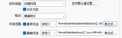 - 控件默认值设置:可以设置控件默认值,可以使用常量,也可以使用表达式,例如使用函数表达式${now()}就可以在控件加载时自动填入当前的日期时间。