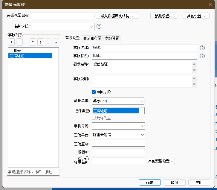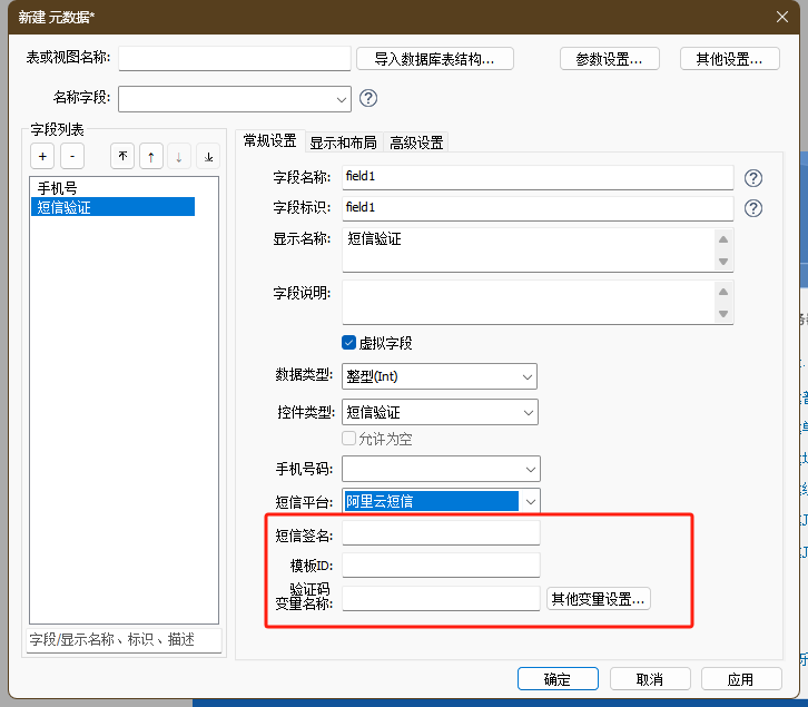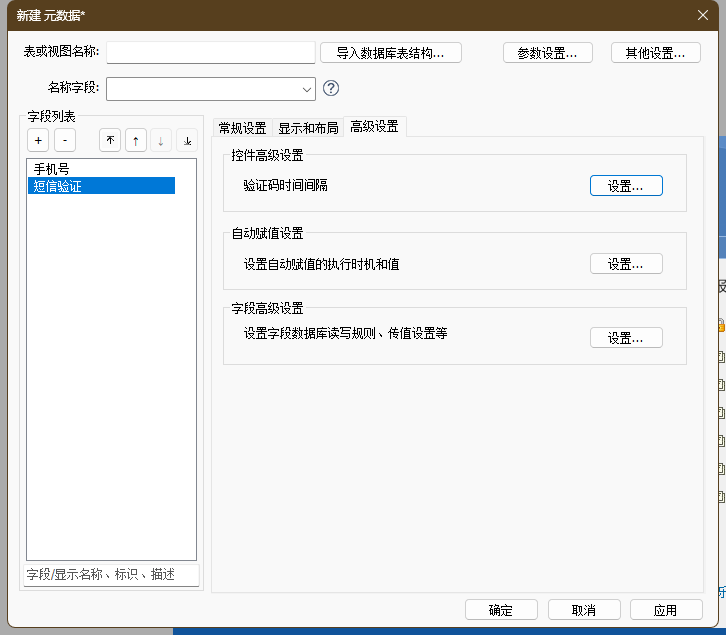- 手机号码字段:在此选择元数据中另一个填写手机号码的字段(填报界面需要另一个字段用于填写接收验证码短信的手机号码)。