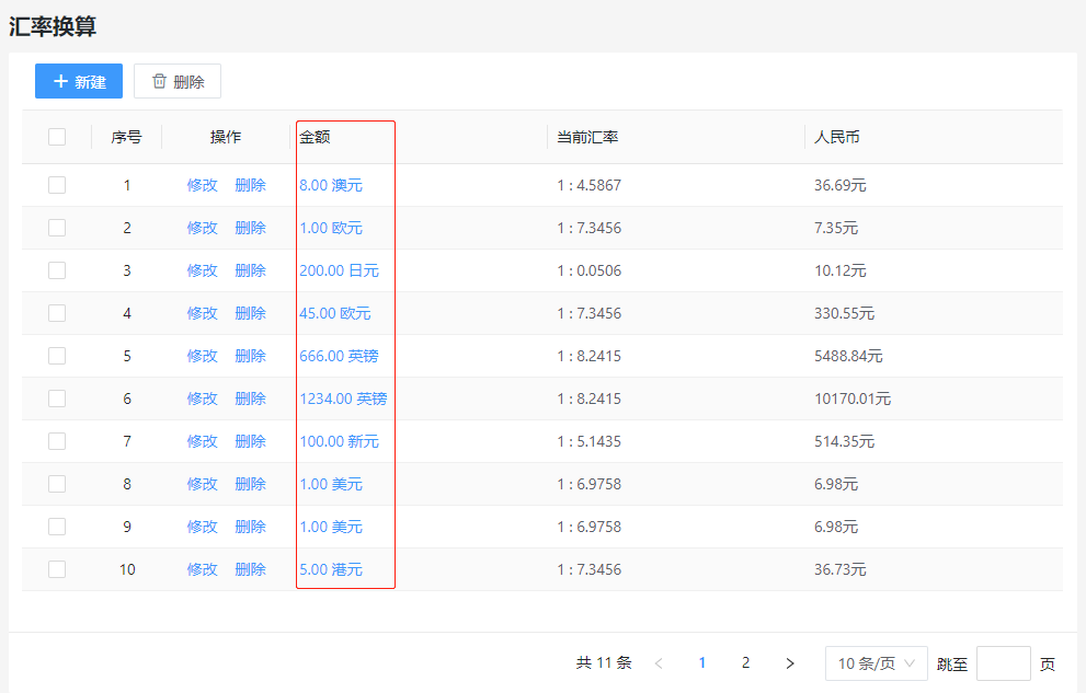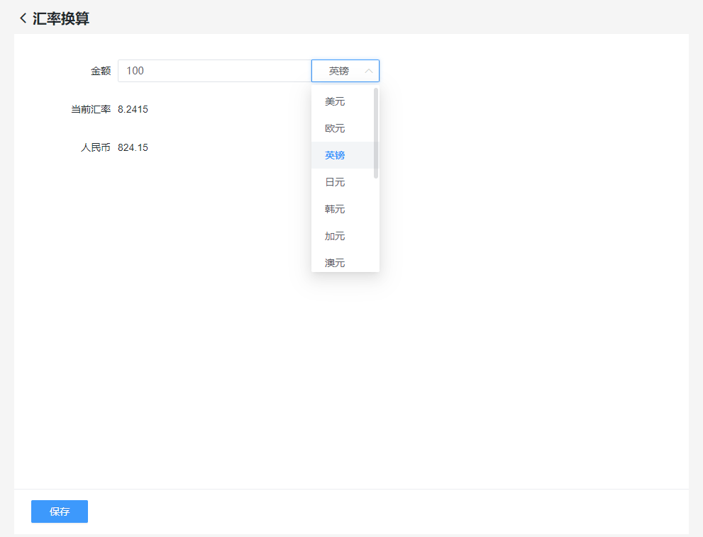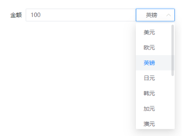 接下来我们结合一个案例来介绍一下这类新控件的使用方法。例如我们要实现一个如下的案例:填写表单时需要记录金额数值和货币单位,并将该笔金额使用当前货币的汇率折算成人民币进行存储。