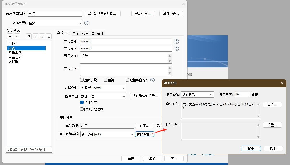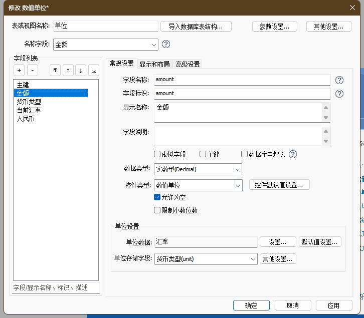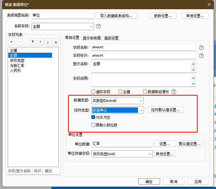- “金额”字段用于实际存储“数值单位”中的“数值”部分,我们给它设置为“数值单位”控件。