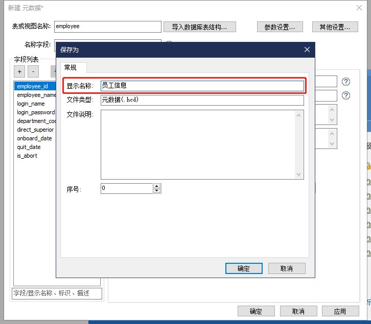 初次保存时可以对元数据的显示名称进行自定义修改,如下图所示我们将示例元数据命名为“员工信息”。