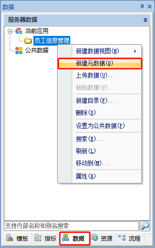 如下图所示,右键单击目录“员工信息管理”,在展开的执行菜单列表中选择[新建元数据]