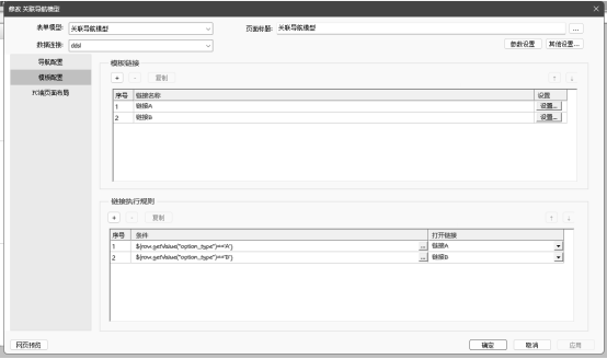 链接执行规则:V7.3.0版本后在【模板链接】中支持配置多个链接地址,可以配置对应的链接执行规则,满足条件时打开对应的链接地址,例如可以通过导航选项值的判定,来决定打开的是哪个连接,如下图所示当导航选项为A时打开链接A,当导航选项为B时打开链接B。注意:未配置链接执行规则或条件不成立时默认打开第一个链接。