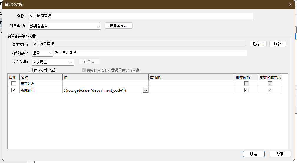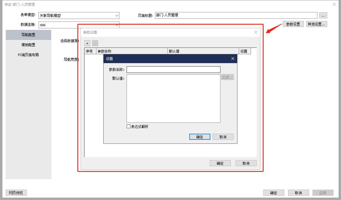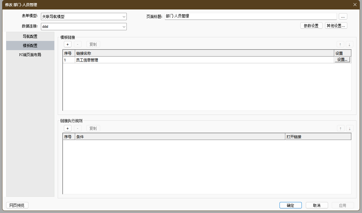 - 此例中我们希望在切换左侧部门选项时自动切换右侧显示模版,显示出当前部门下的人员列表,因此我们选择提前准备好的跨设备表单“员工信息管理”模版文件,页面类型选择“列表”,通过模版上提前定义的“所属部门”参数与左侧导航数据的“部门编码department_code”字段进行关联,如上图所示。至此,已完成关联导航模型的关键配置,可以基本的进行预览查看了。