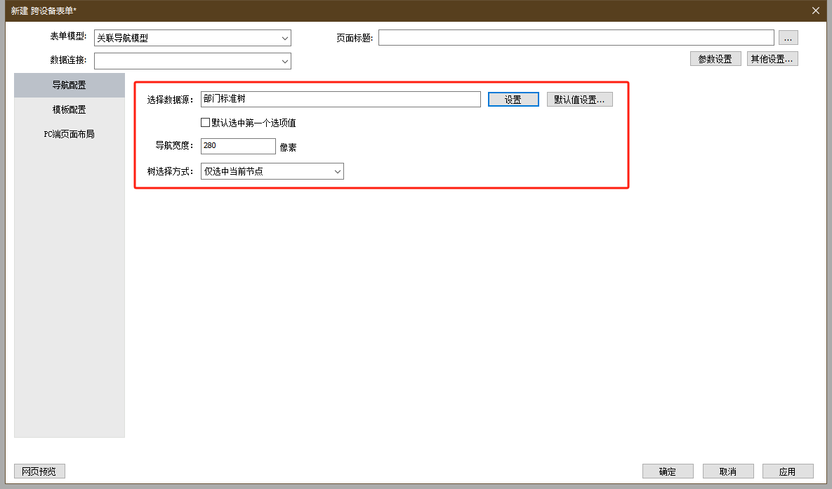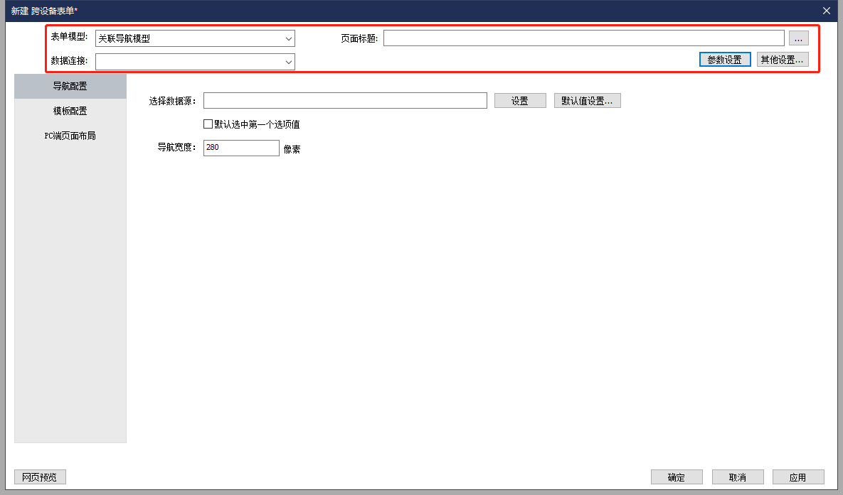 表单模型选择“关联导航模型”,页面标题、数据连接等常规配置同其他模版,均不允许为空。