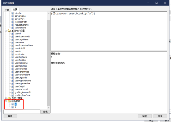添加的参数在前端不作显示,可用于模版被链接时接收外部传参,添加后的参数在模版内表达式编辑器【资源】中显示相应【模版参数】,表达式为${lczServer:searchConfig(“变量名称”)},如下图所示。