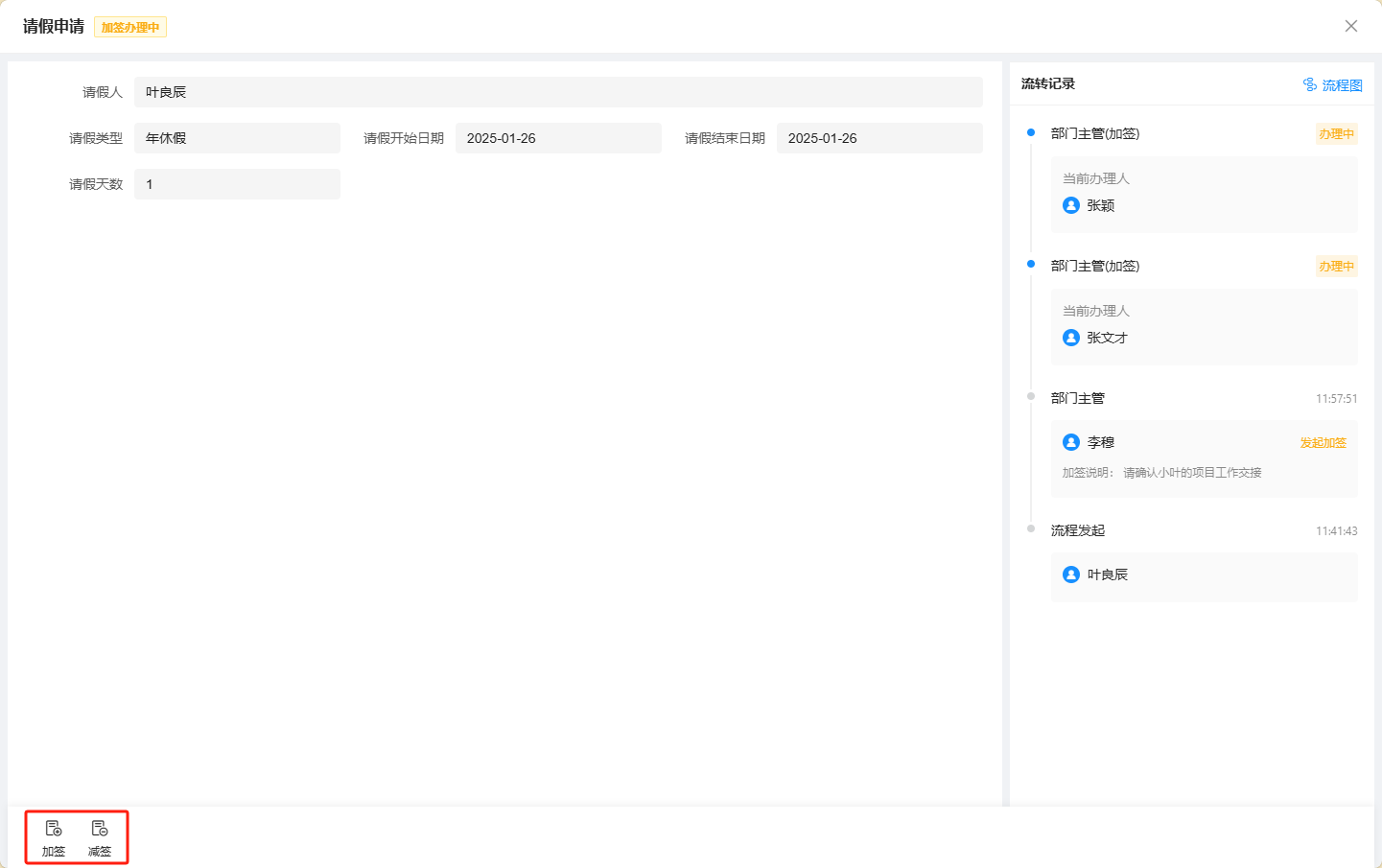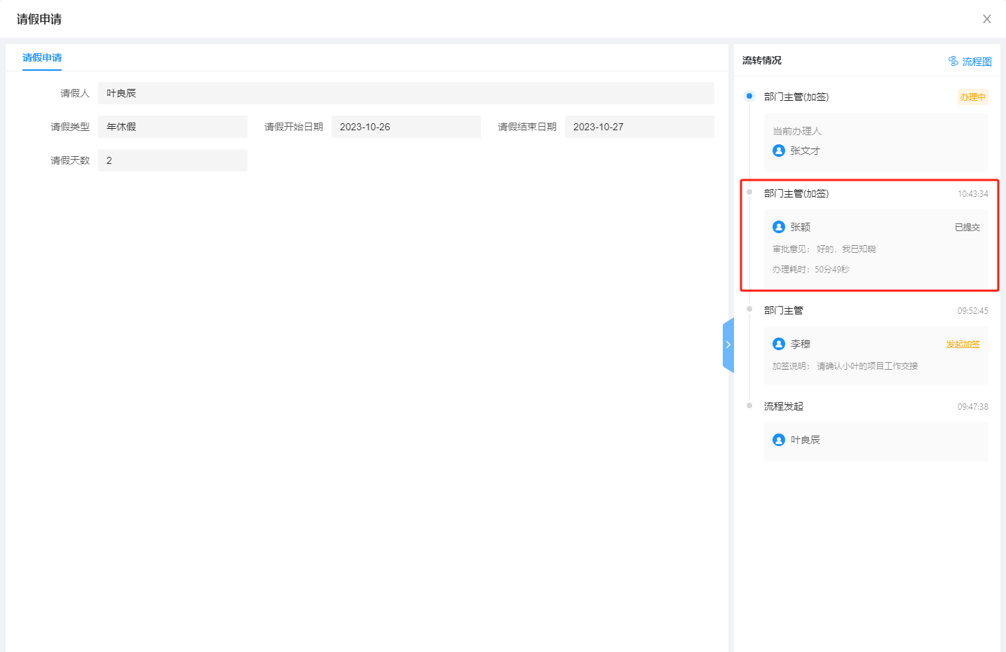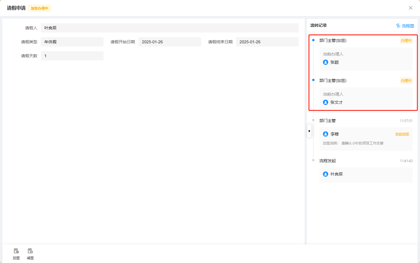 案例场景:采购部的员工叶良辰发起了一个紧急请假申请,流转到了部门经理李穆的审批环节,李穆先行同意流程,但需要将叶良辰的工作进行交办,于是加签给同部门张文才确认未完成的采购工作任务,张文才确认和通过后该流程才能向后流转。
