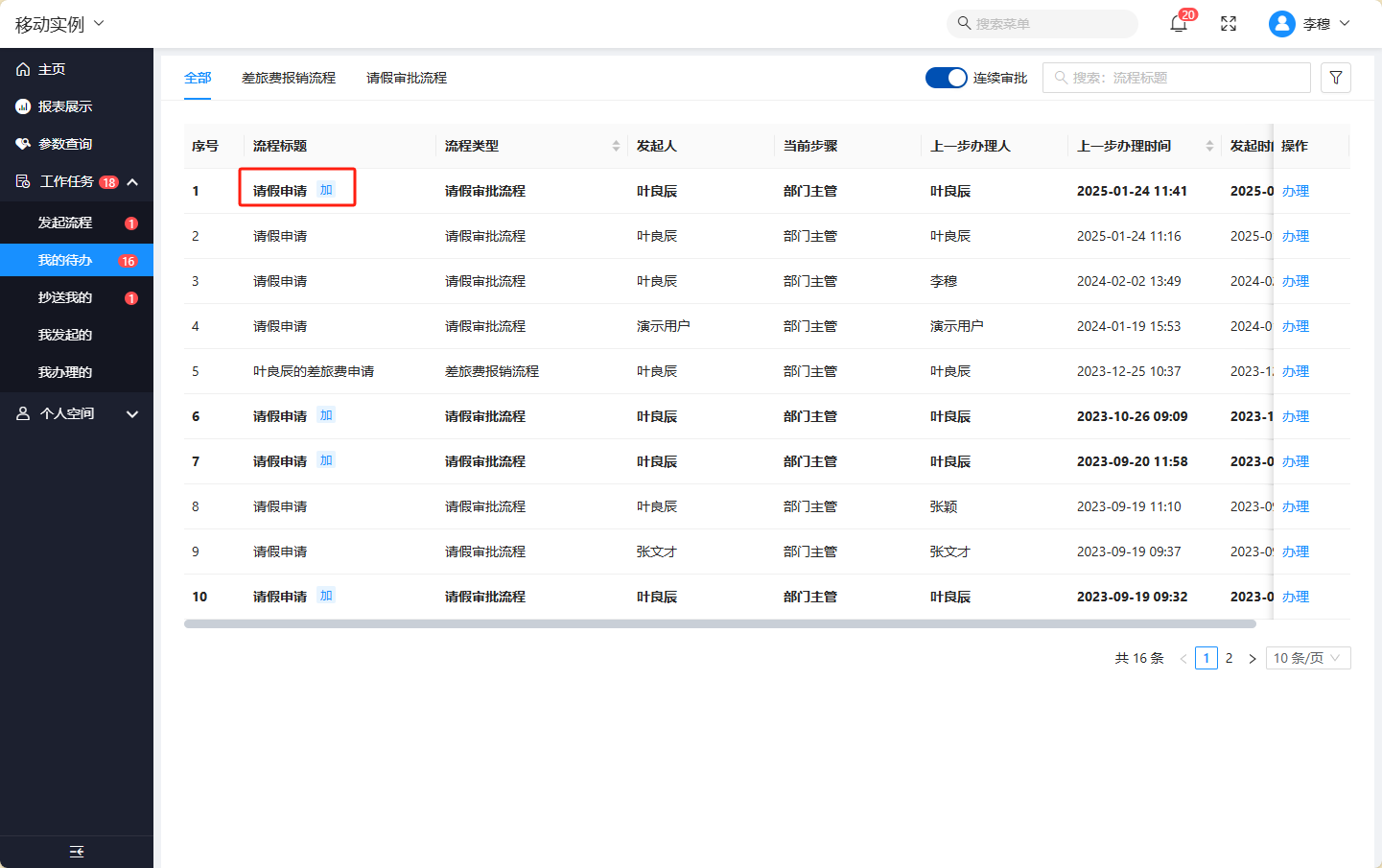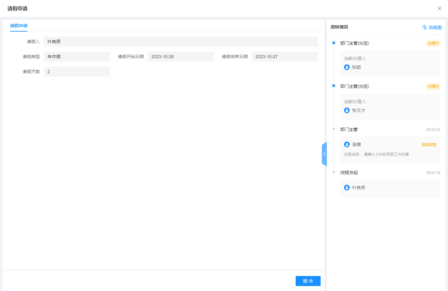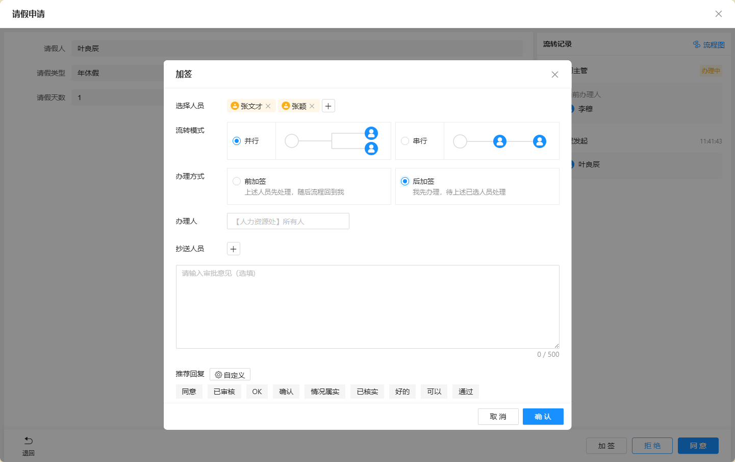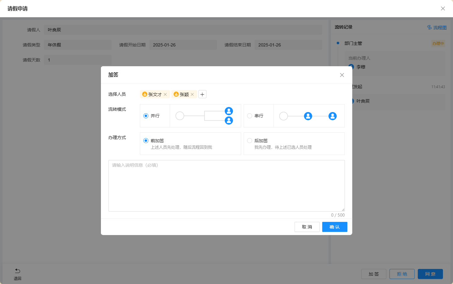 案例场景:采购部的员工叶良辰发起了一个紧急请假申请,流转到了部门经理李穆的审批环节,李穆先行同意流程,但需要将叶良辰的工作进行交办,于是加签给同部门张文才确认未完成的采购工作任务,张文才确认和通过后该流程才能向后流转。