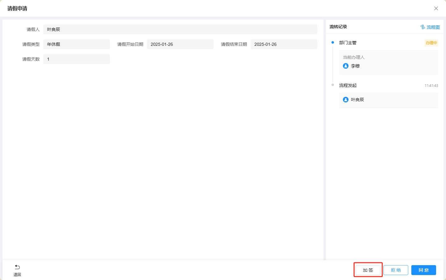 因为已经在“请假审批流程”的部门经理节点配置了加签扩展按钮,因此当叶良辰发起请假审批流程后,流程流转到部门经理李穆这里时,李穆就可以在流程审批界面看到“加签”按钮。