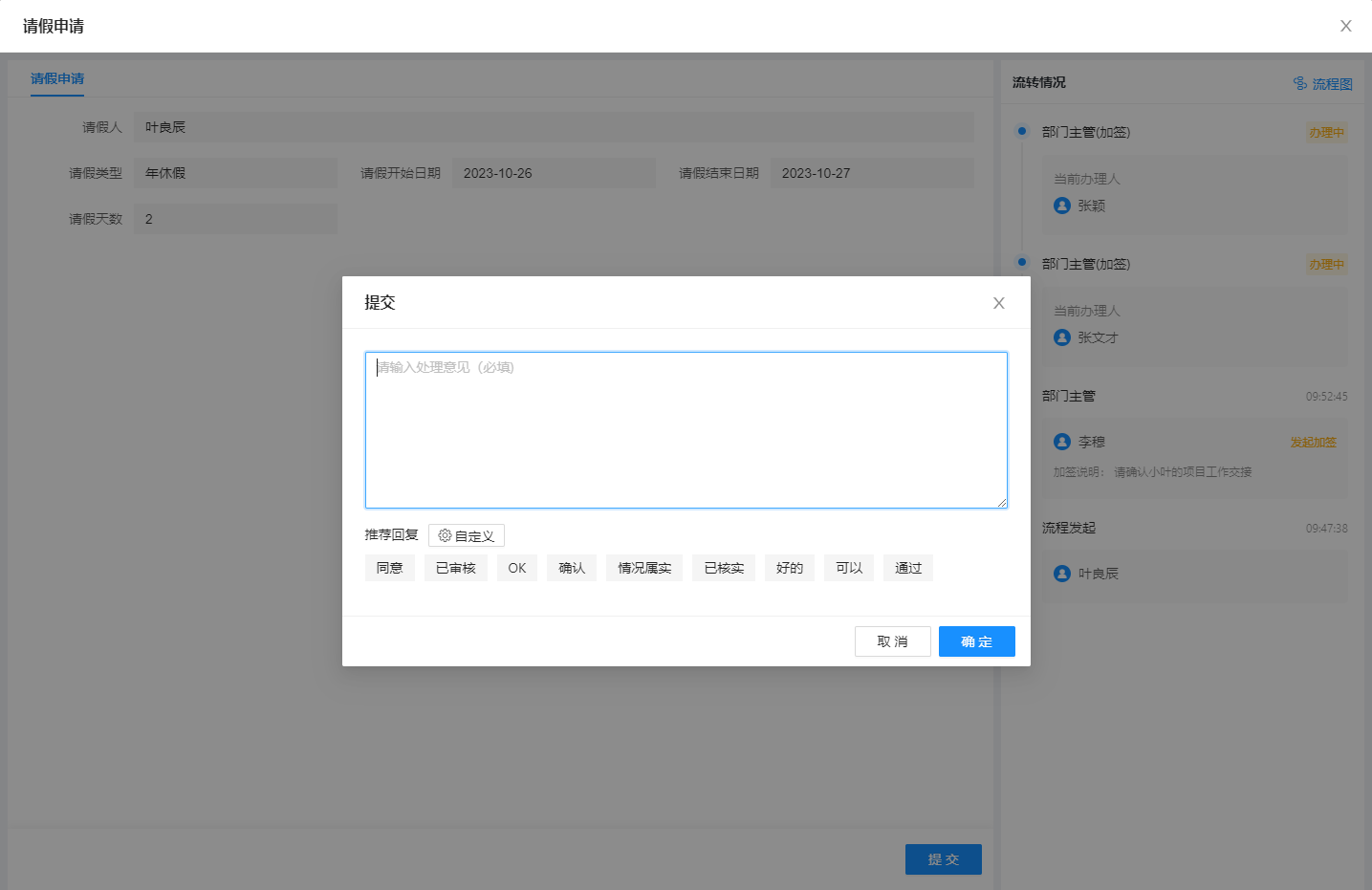 案例场景:采购部的员工叶良辰发起了一个请假申请,流转到了部门经理李穆的审批环节,只要李穆这里提交以后流程流转到总经理那里再经人事确认流程就走完了。但部门经理李穆考虑到当前还有未完成的采购工作任务,希望通过加签确认同部门的张文才和张颖是否已完成叶良辰的工作交接后再进行批复。