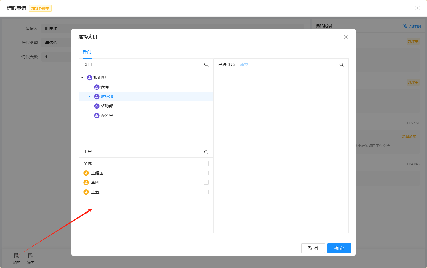 - 选择人员后点击【确定】,提交减签后,自动刷新流程详情页面。如果没有更多未处理的加签接收人时,隐藏【减签】操作按钮。刷新流转情况,如办理中的加签接收人被移除则不再显示该人员,流转情况中不会体现减签记录。