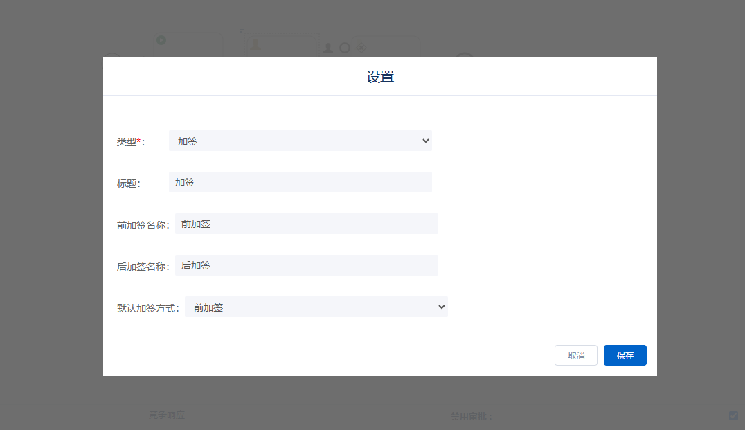 在【加签】按钮的详细配置中,可以对按钮标题、加签界面前/后加签描述和默认加签方式进行配置,如下图所示。