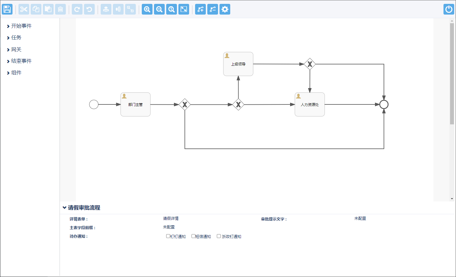 加签目前作为用户任务节点的可选功能在流程设计时可以在节点上以扩展按钮的方式配置,同“退回”、“终止”、“反签收”的配置方式。如下图所示,我们在流程实例“请假审批流程”中为各审批节点都添加了“加签”操作,意味着这些节点都允许在审批时发起加签了。