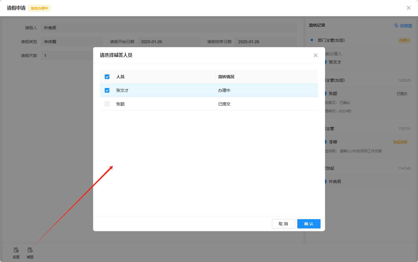 单击【减签】,在弹出弹窗【请选择减签人员】,列表会显示出当前加签的全部人员,并显示其流转情况。