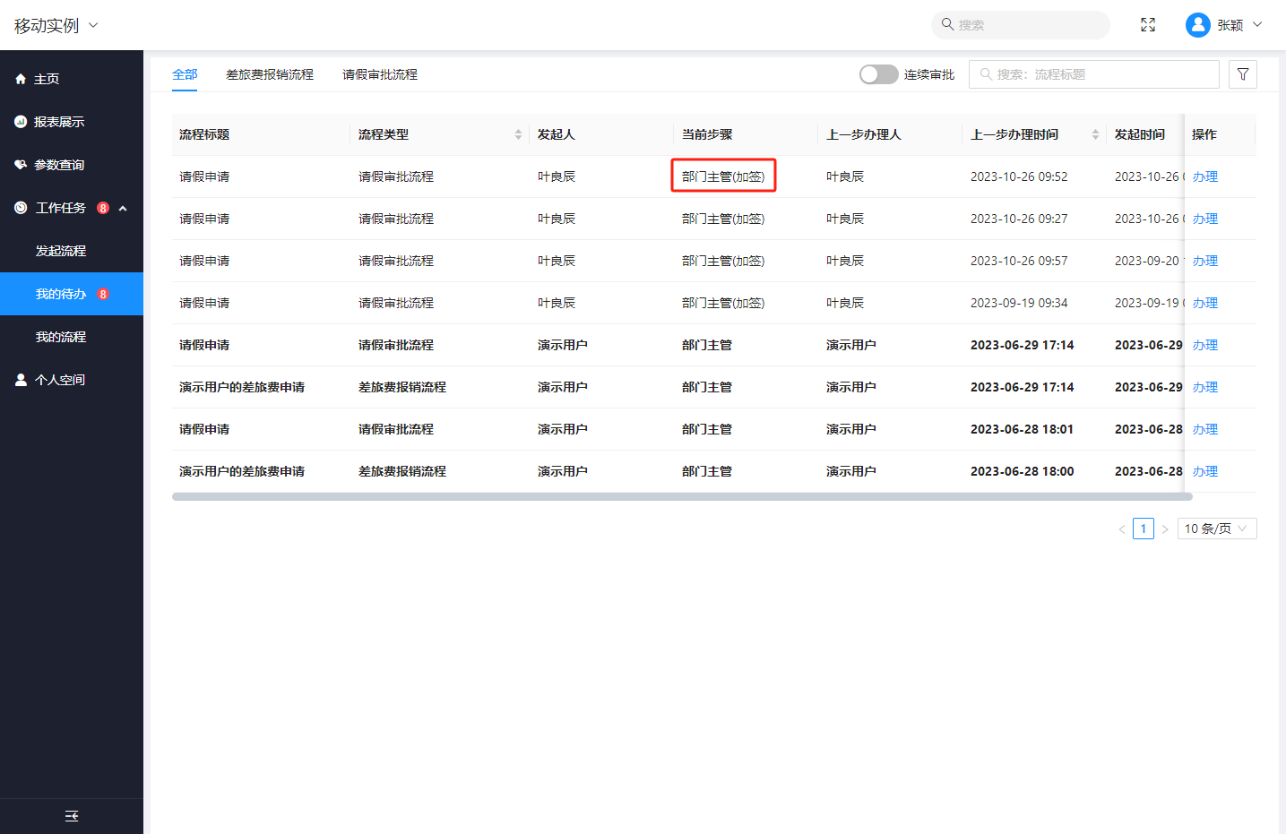 加签发起后,加签接收人【我的待办】中会收到相应的加签待办任务(自动签收),在列表中当前步骤标识为“环节名称(加签)”。