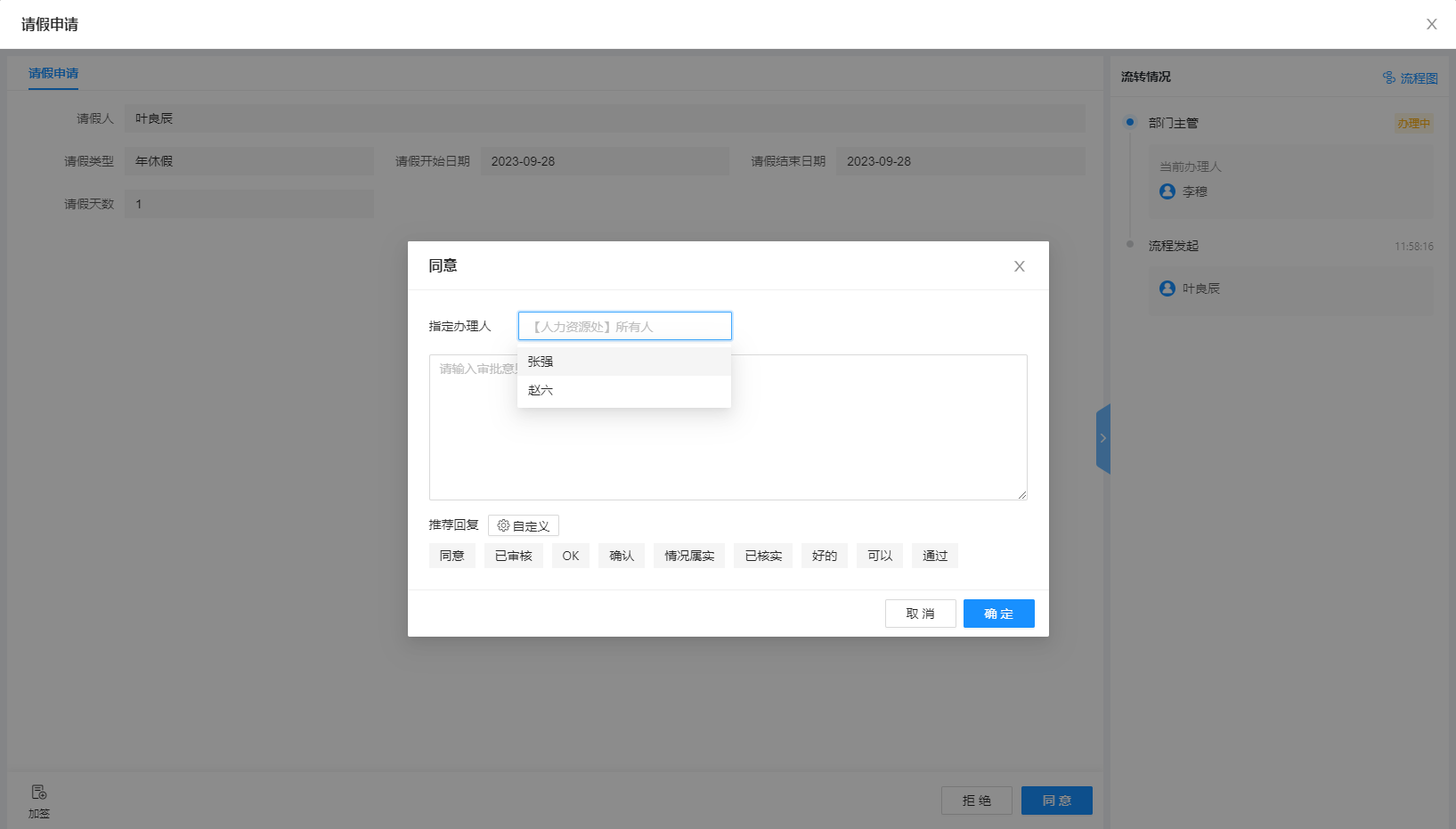 叶良辰提交了请假申请后,主管李穆审批后即将跳转【人力资源处】进行审批,由于【人力资源处】配置了当前节点办理人允许指定,于是在前一节点提交审批意见时就允许从【人力资源处】的响应人中选择指定的办理人。
