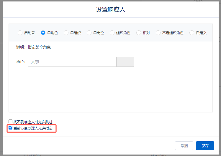 例如希望“请假审批流程”下的“人力资源处”审批节点在前一步提交时允许从设计的响应人范围内选择指定办理人,可以在对应的用户节点上勾选“当前节点办理人允许指定”,如下图所示。