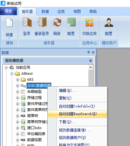 为满足字段控件数据源可以是数据视图(JDBC数据、存储过程等)的使用需求,乐创者提供了为数据视图类数据创建BDOeasysearch的功能,可以实现的功能如下。