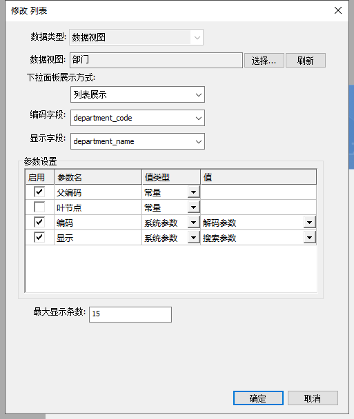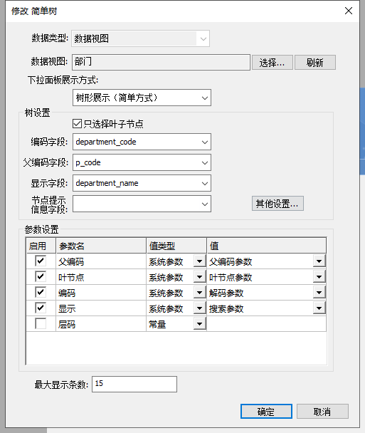 参数设置:参数列表为用户在数据视图创建时自行设计。简单树展示方式下,除了【解码参数】和【搜索参数】,要形成树形结构还必须配置和启用系统参数【父编码参数】和【叶节点参数】,如上图所示。