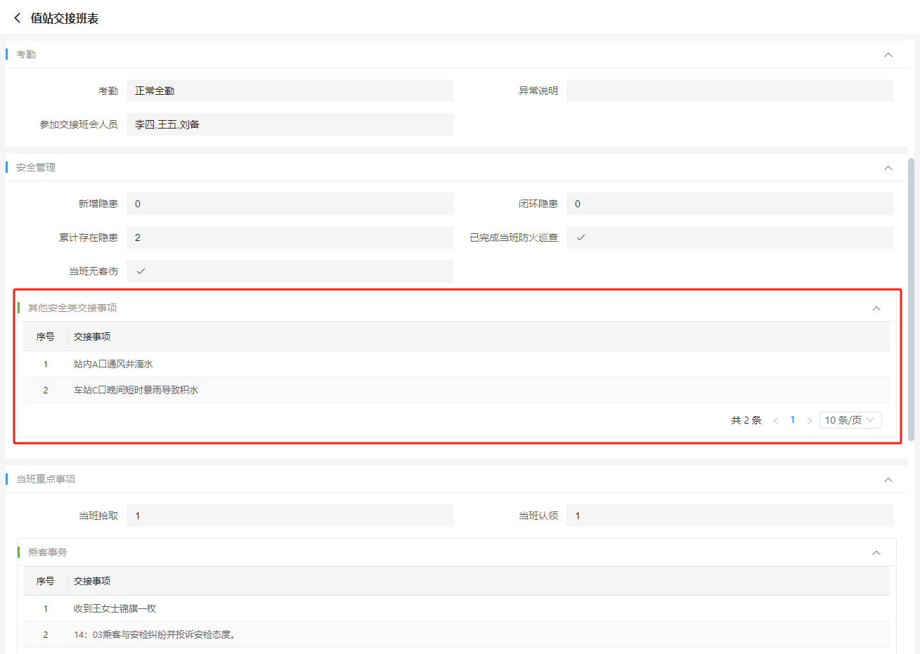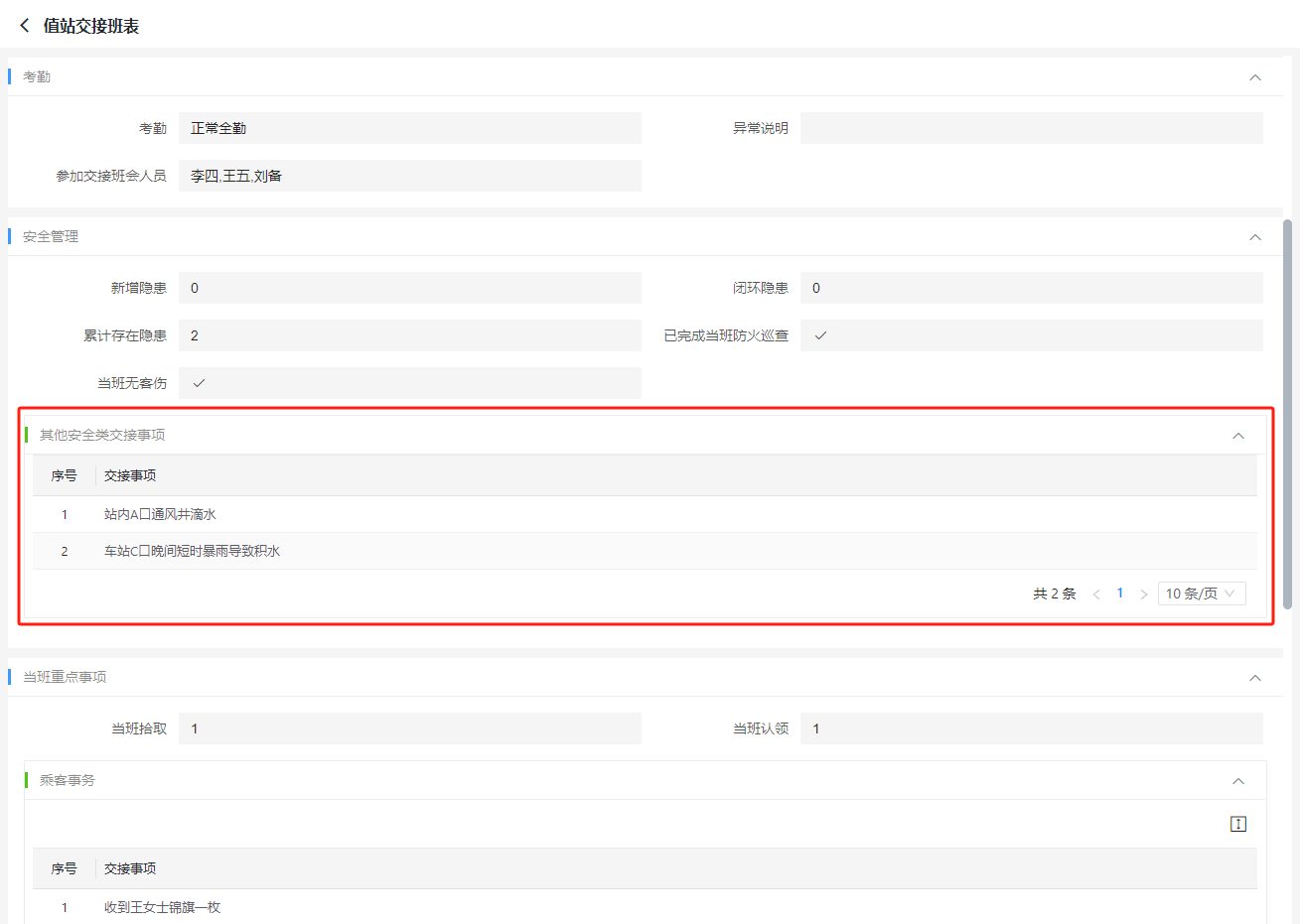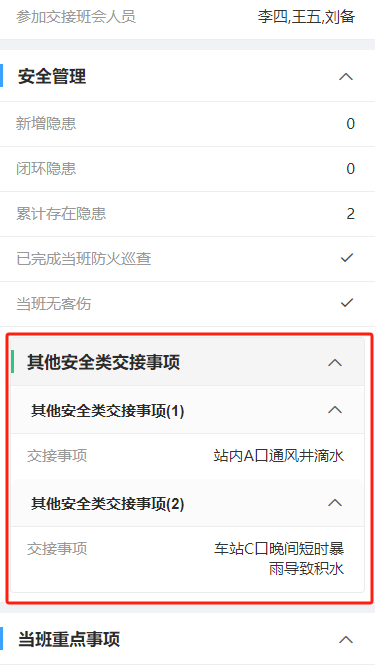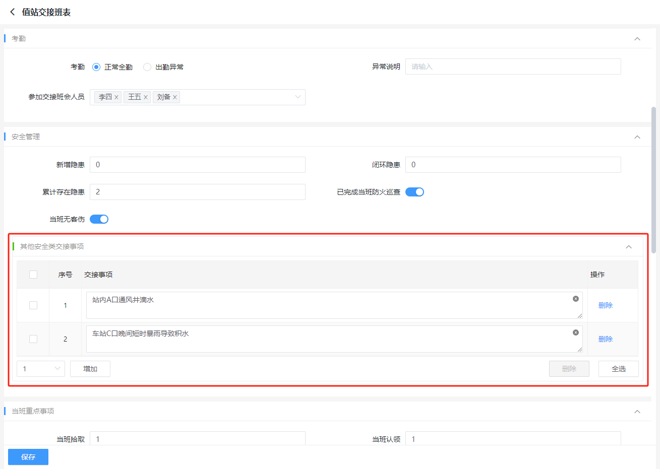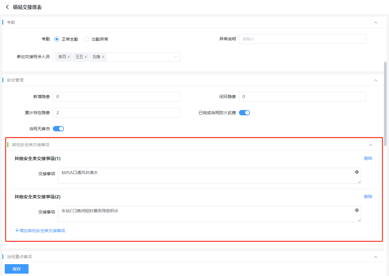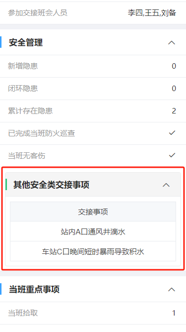 例如:某值班交接表中主表字段分成了多组,其中在【安全管理】分组下需要维护一个列表来记录需要交接的安全事项,该列表理应是通过与主表记录关联的从表来实现,但其业务属于【安全管理】范畴,不适合展示在底部或与主表平级以tab方式展示,需要能够如下图所示显示在主表的字段之间,这里就可以用到我们的“子表容器”控件。