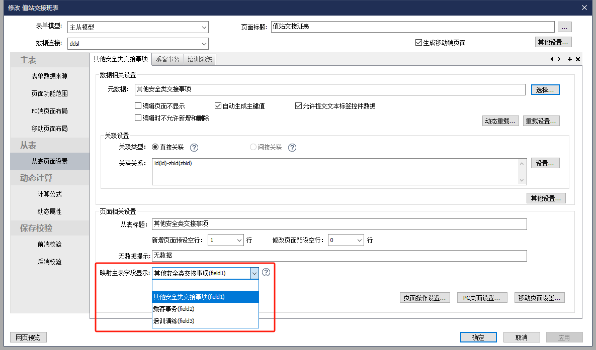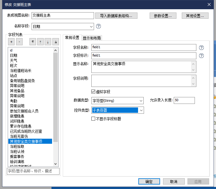 首先需要在需要使用的主表元数据中定义一个子表容器字段,并根据从表需要在主表中展示的位置调整好该字段的排序,例如案例中的“其他安全类交接事项”列表,就需要放置在同一分组下的“当班无客伤”字段以后。