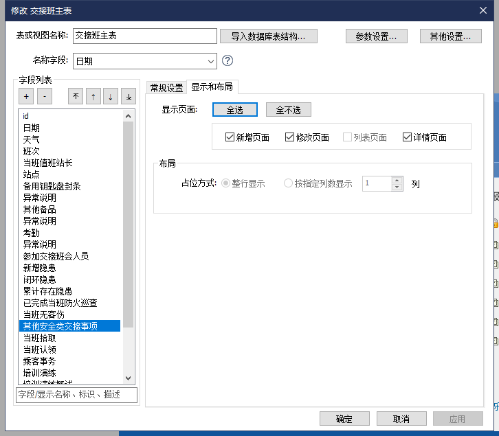 - 仅支持配置【显示页面】和【布局】,其中【显示页面】仅支持选择新增、修改、详情页面,【布局】仅支持选择“整行显示”。