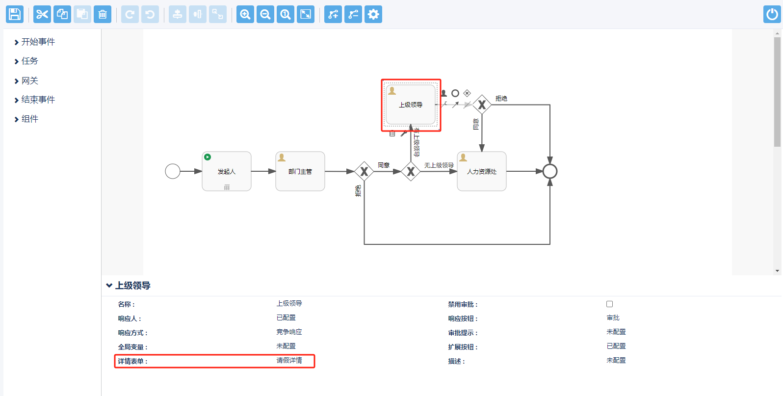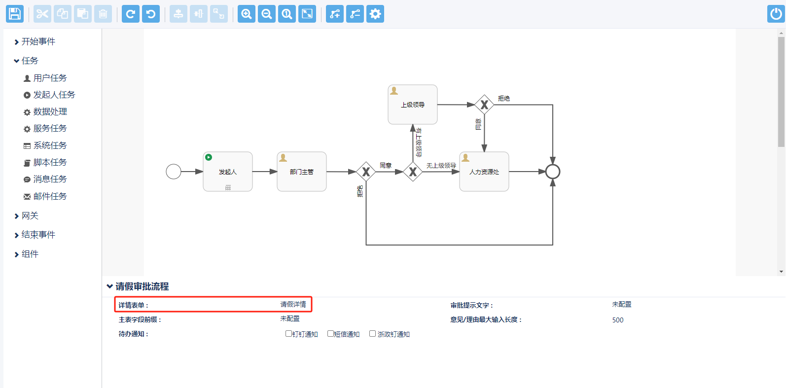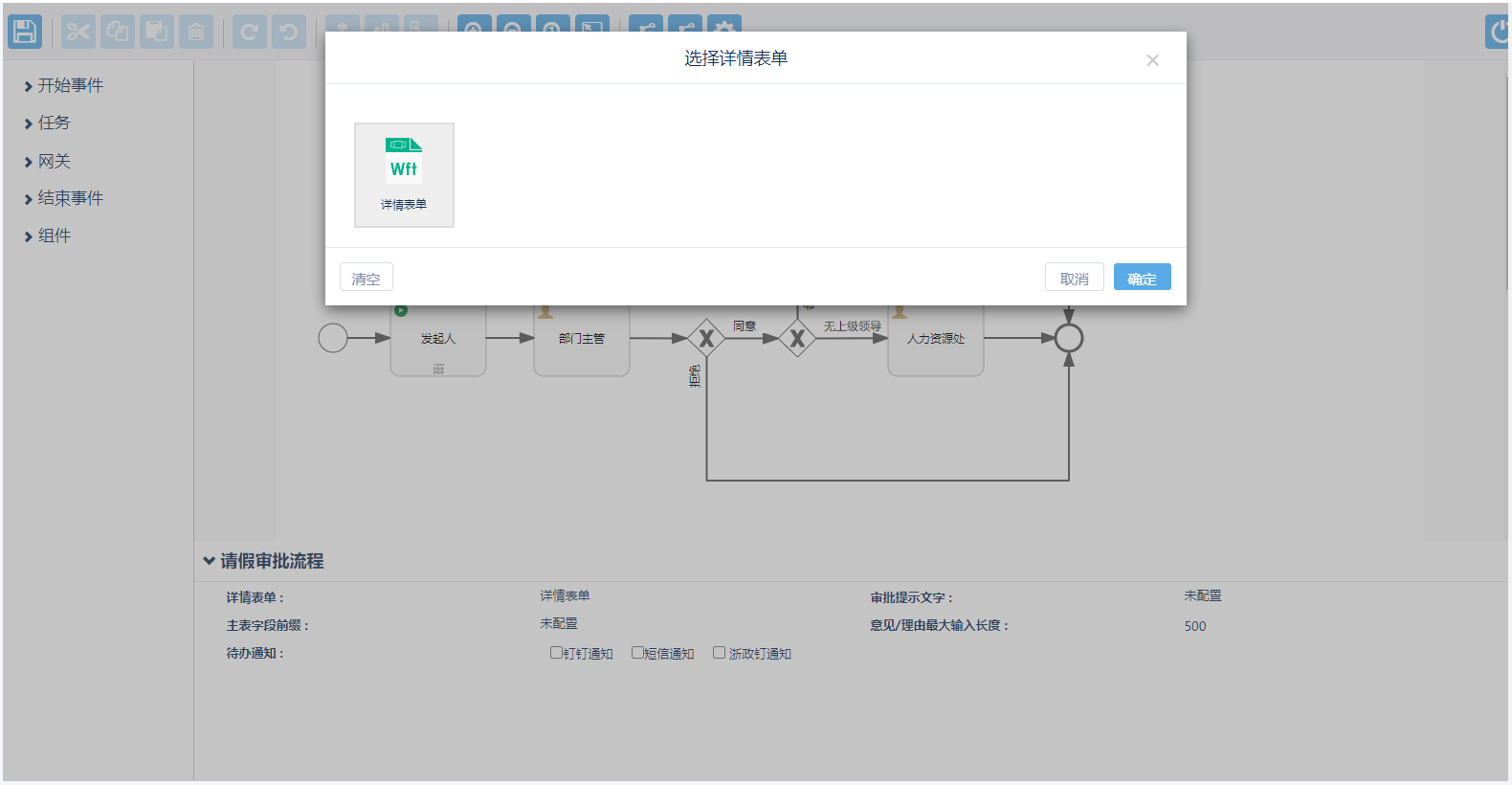 所谓全局详情表单就是指在流程图设计界面上未选中任一用户任务节点时在流程全局配置的详情表单,好处是只需一处配置就可以应用到所有的用户任务节点,无需去用户任务节点上单独设置,方便设计人员配置。