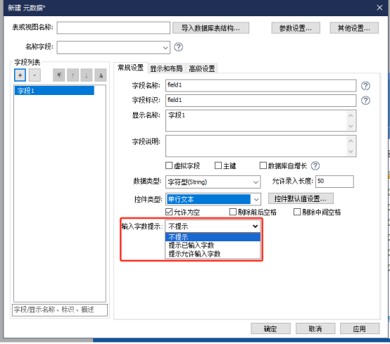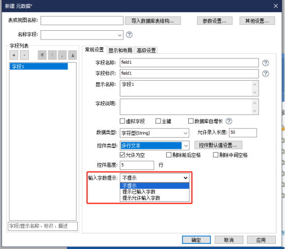 字段数据类型为“字符型”或“文本型”的单行文本控件及多行文本控件在【常规配置】中新增了配置项【输入字数提示】,可选项“不提示/提示已输入字数/提示允许输入字数”,默认选中“不提示”。