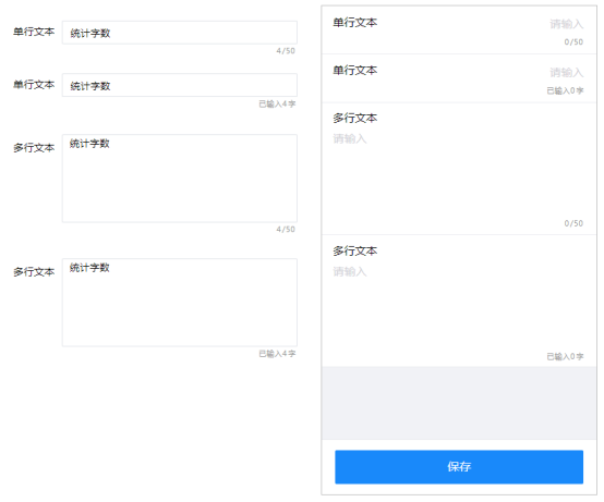 跨设备表单在版本V6.9.4中支持了对单行文本和多行文本控件输入字符数统计的功能,以解决部分场景下需要在输入文字是实时提示已输入的字数或允许输入的最大字数。