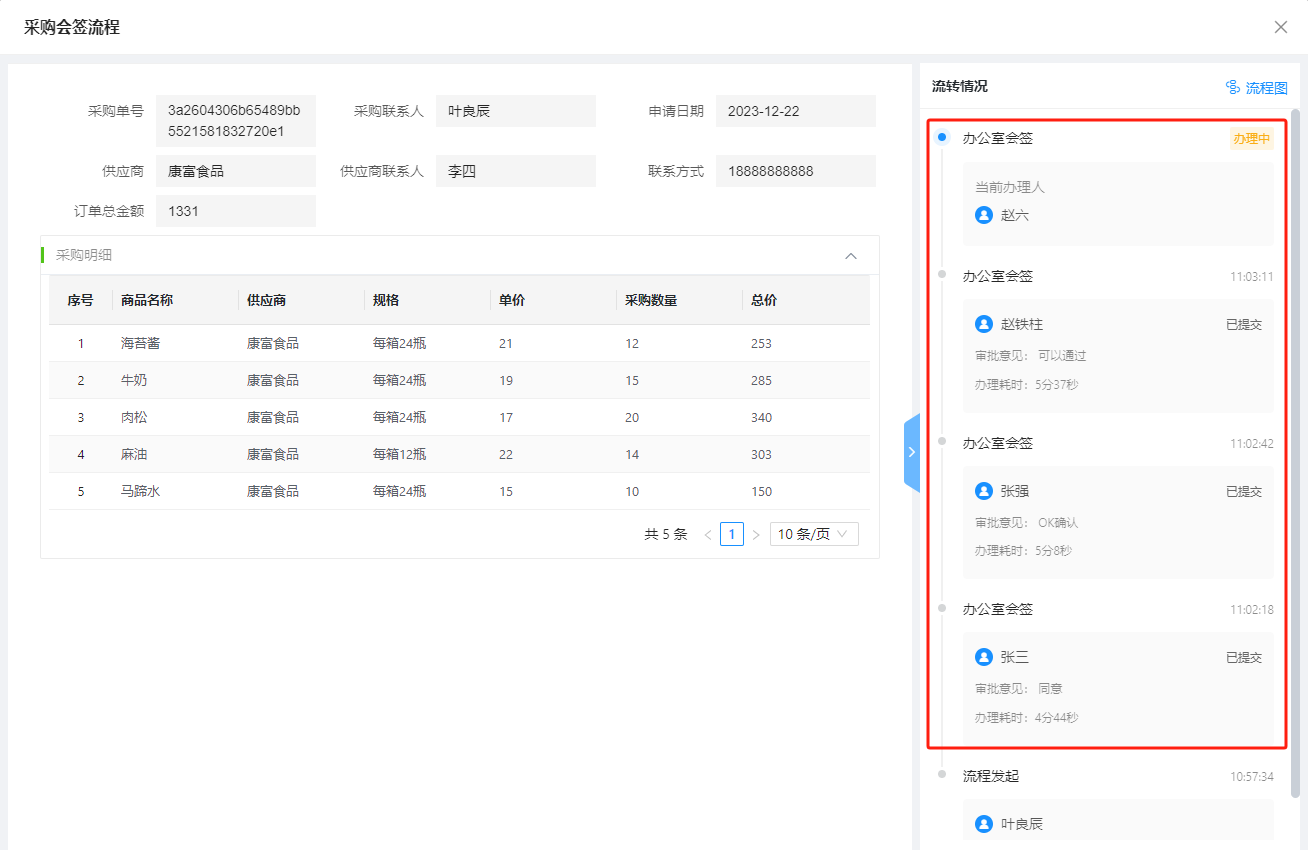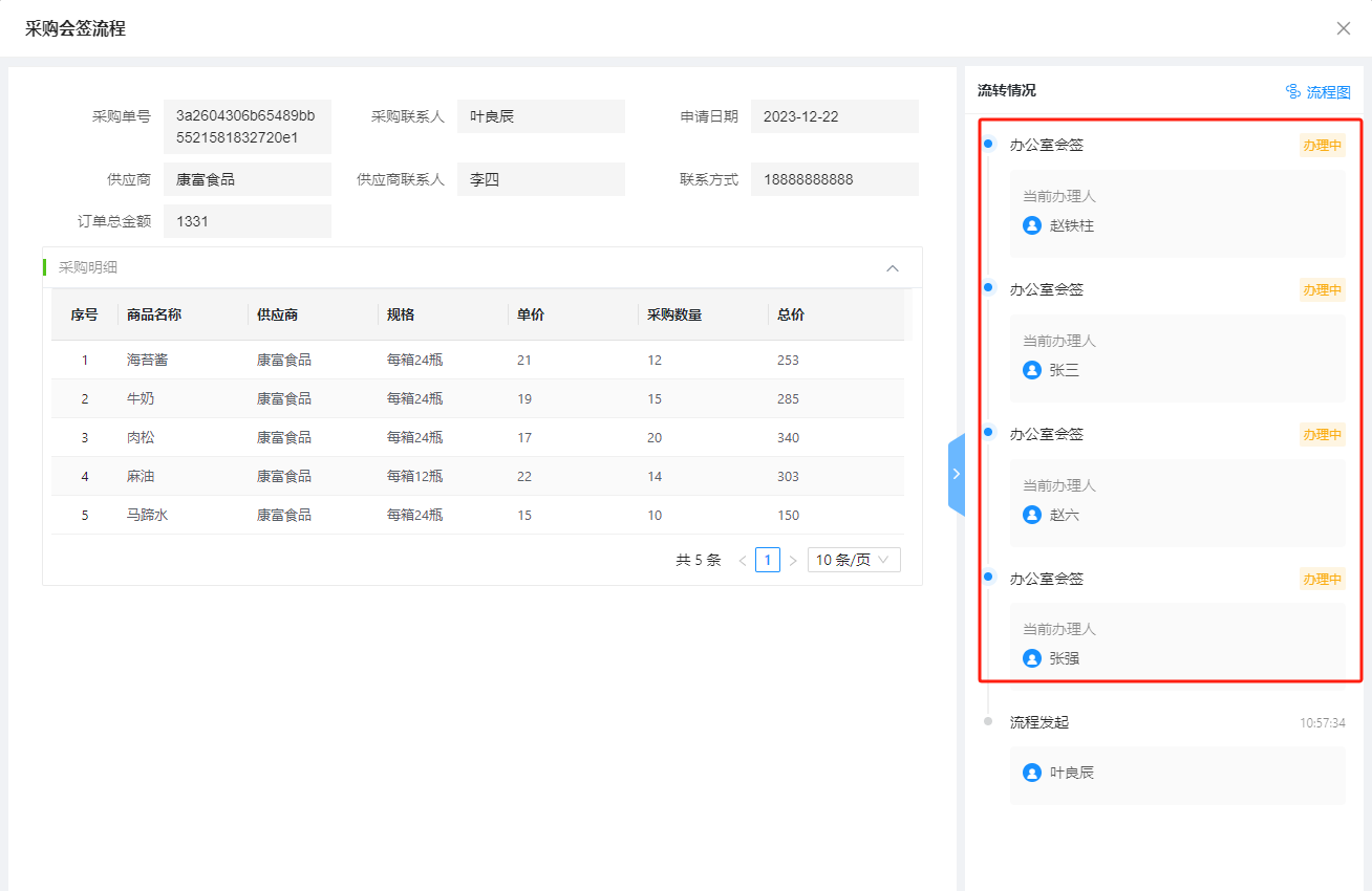 案例场景:员工叶良辰发起了一个采购申请,需要办公室各位领导会签确认后,才能移交给财务部门确认。