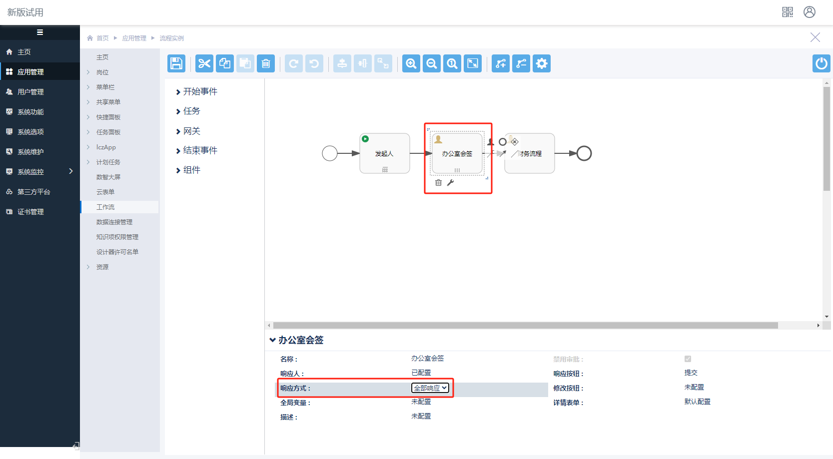 【响应方式】配置为“全部响应”就表示流程流转到当前用户任务节点时需要当前用户任务的所有人响应以后才能继续向下流转,从而达到会签的效果。