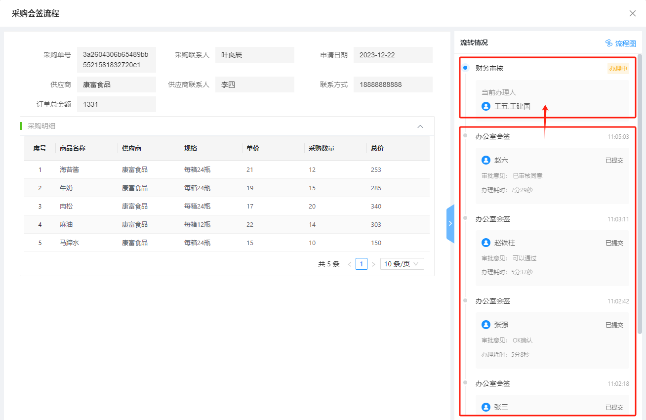 直到【办公室会签】环节响应人全部处理完成,流程才流转至【财务审核】