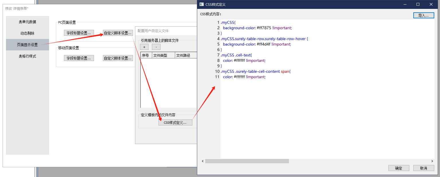 若上述预设的CSS样式类不能满足业务应用场景,用户也可以自己在【页面显示设置】中为相应的页面自定义CSS样式类,再到此处填写对应的类名,就可以按自定义的CSS行样式生效,支持定义的样式有背景色、字体颜色、序号字体颜色等。