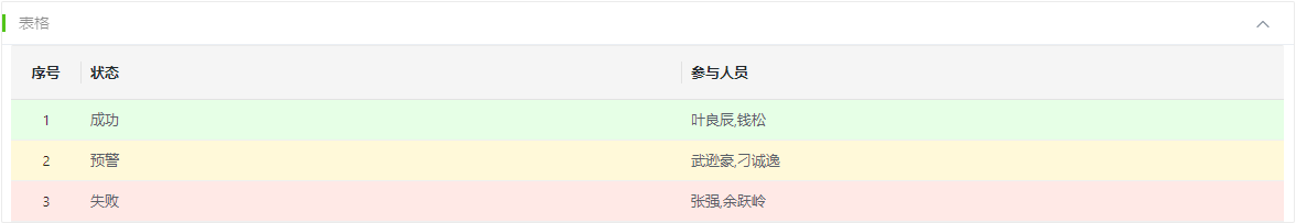 CSS样式类:此处预设了三种常用的样式供设计人员快速配置,“成功”对应行背景色为绿色,“预警”对应行背景色为橙色,“失败”对应行背景色为红色,对应的行样式如下图所示。