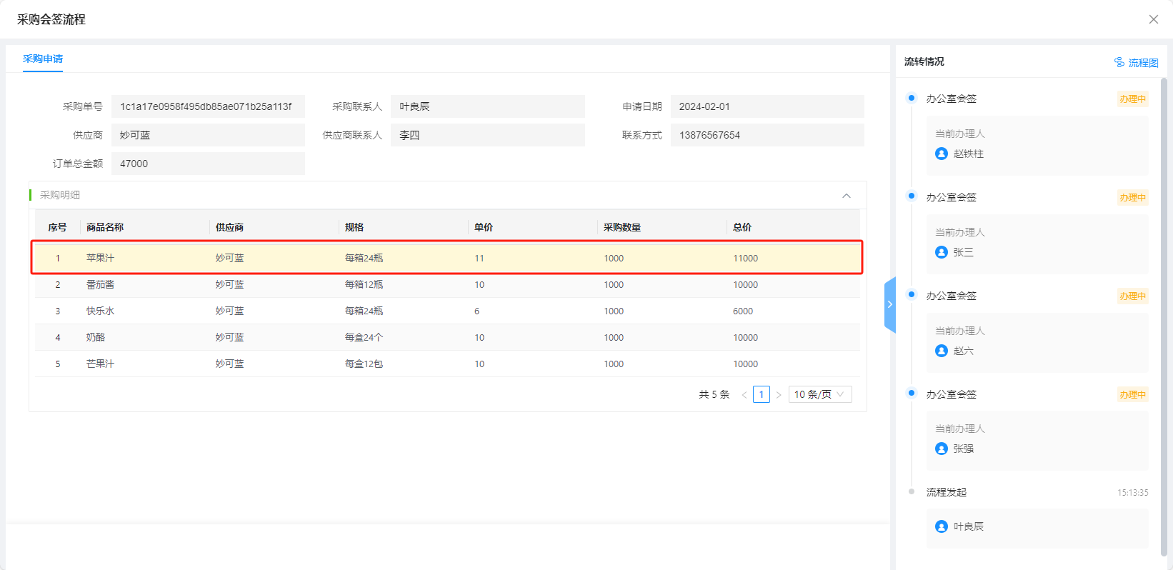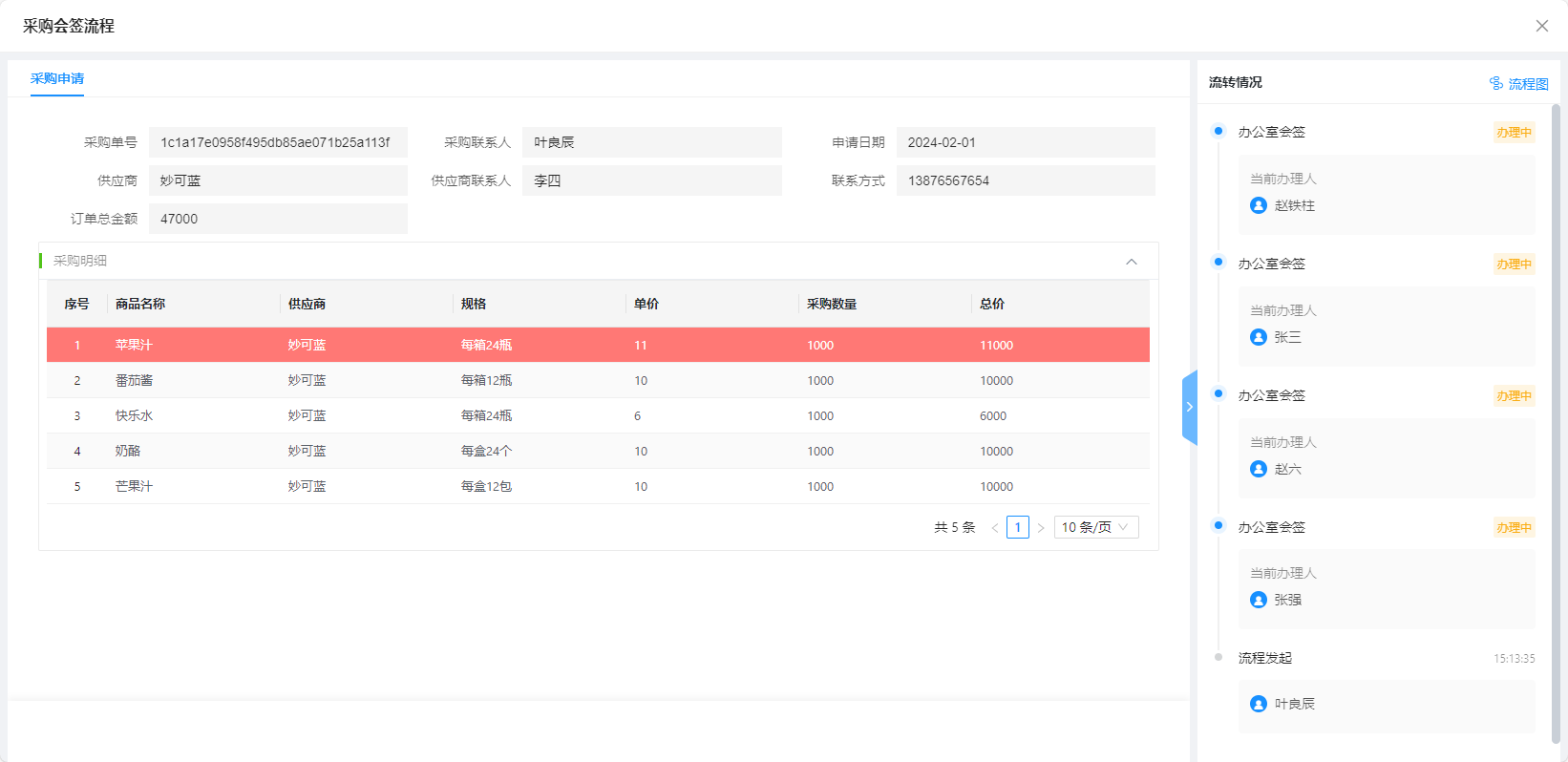 执行效果如下图所示,采购明细中“苹果汁”总价超过了10000元,满足行样式生效条件,在审批页面以橙色预警样式显示。