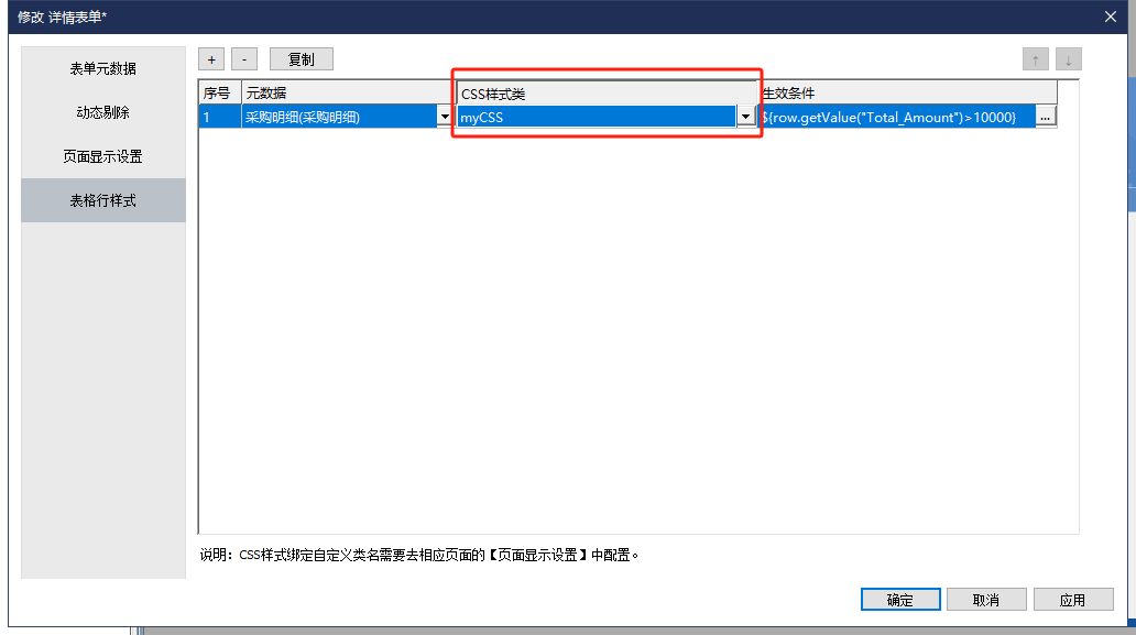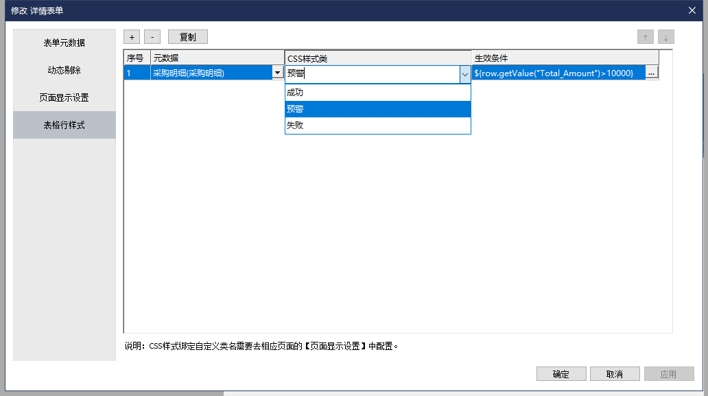 例如案例中我们的条件是采购明细中的商品总价大于10000元时需要预警显示,就需要选择明细元数据,可以使用预设的“预警”样式,生效条件为“${row.getValue(“Total_Amount”)>10000}”