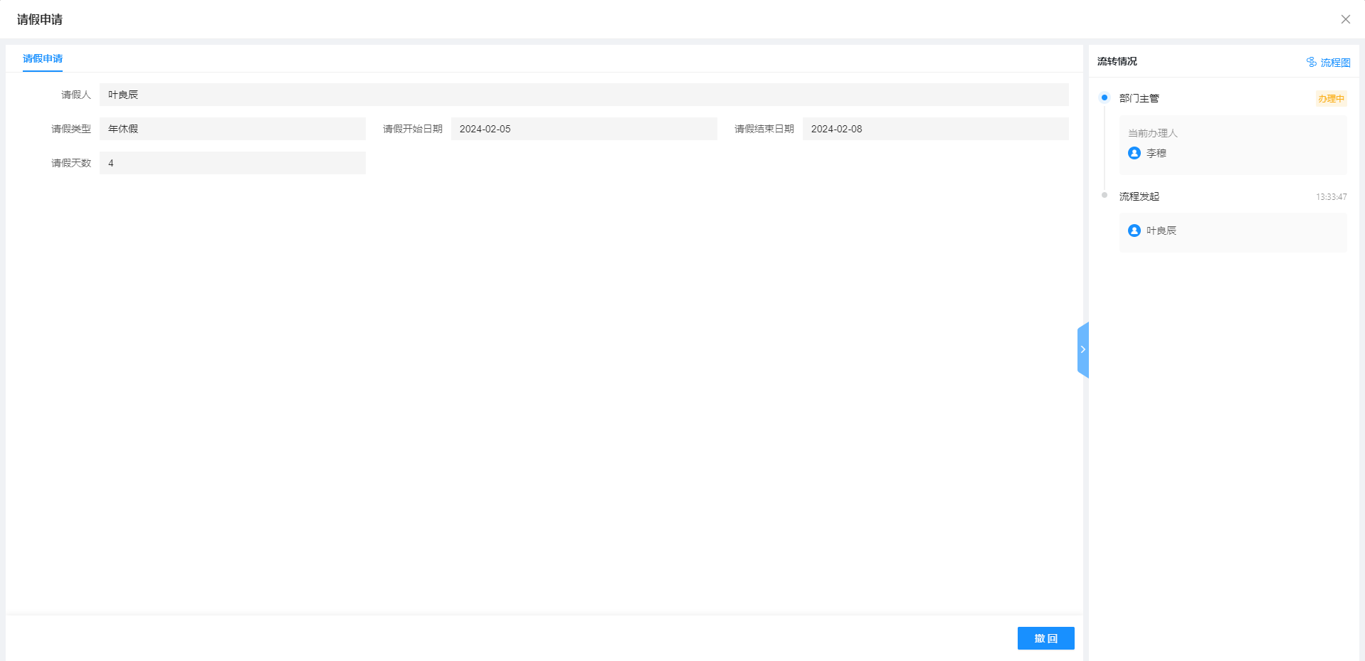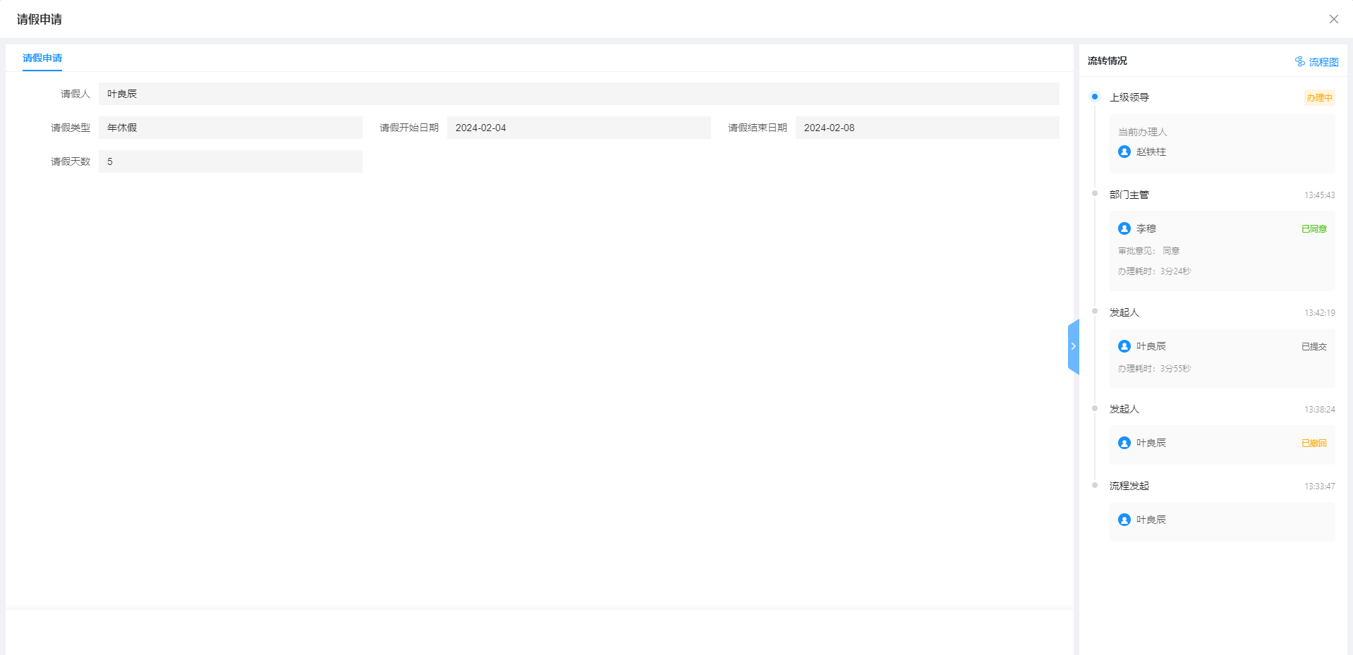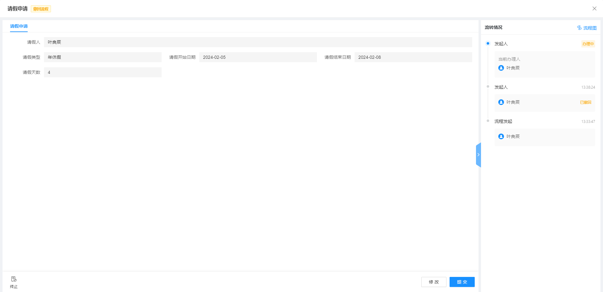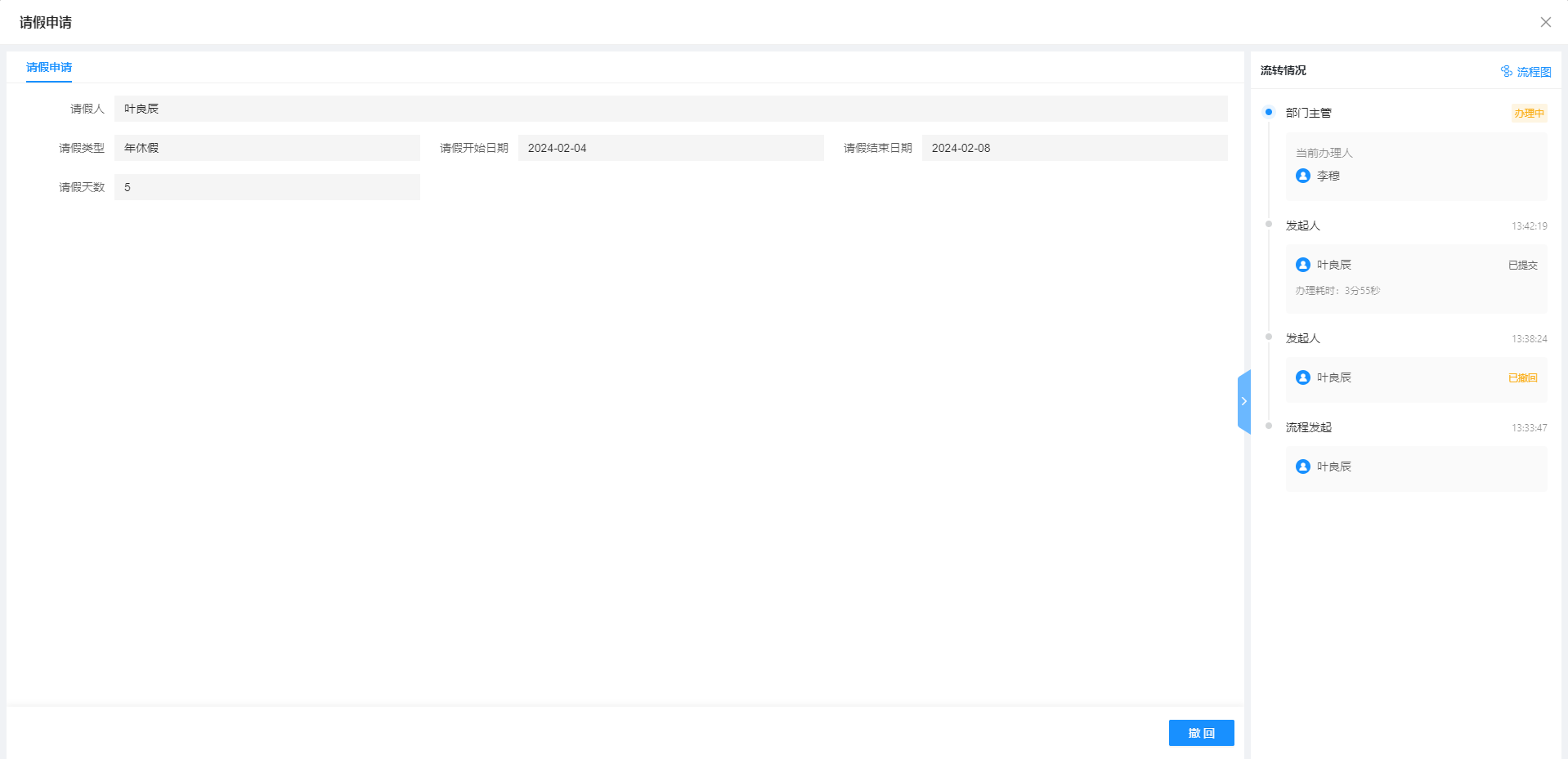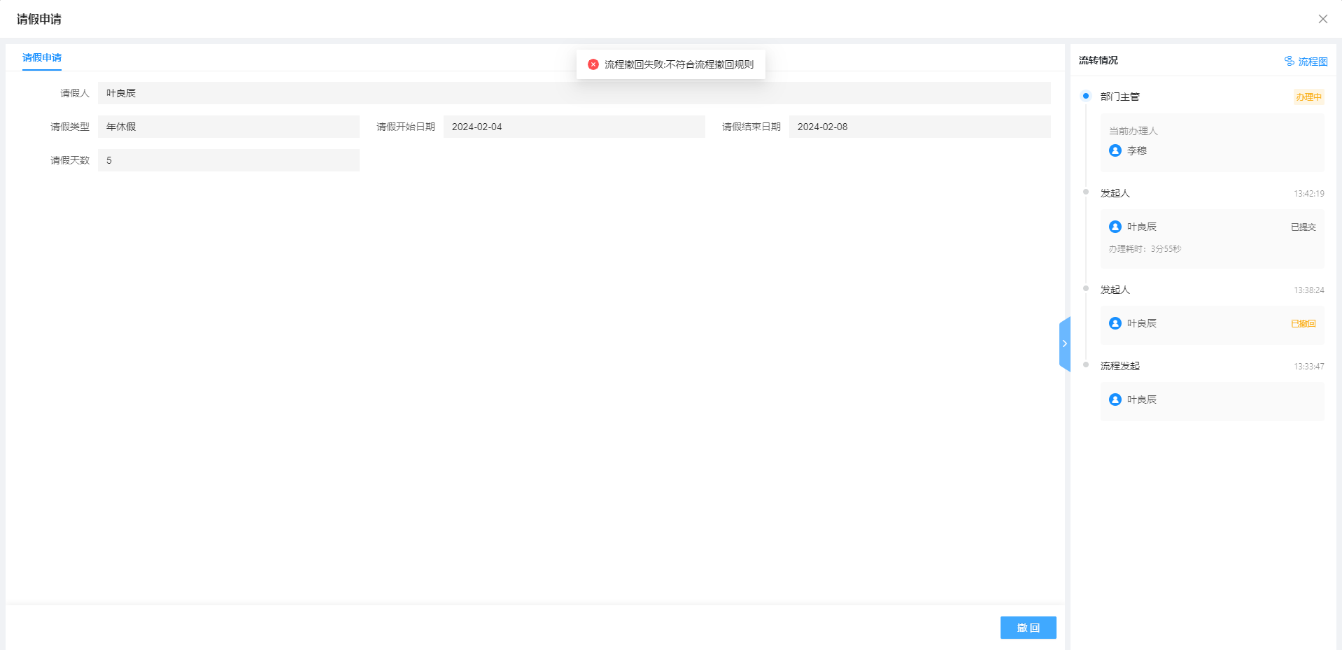 案例2:员工叶良辰发起了一个请假流程,查看流程进度时发现自己的请假日期填写有误,此时流程已经流经【部门主管】正在由【人力资源部】进行审批,但流程尚未办结,此时叶良辰有权撤回该流程进行表单内容修改后重新提交,按流程图重新流转和审批。又或是在发起请假流程后,发现自己临时不需要请假了,也可以在流程办结前撤回当前流程,终止作废此次请假流程。