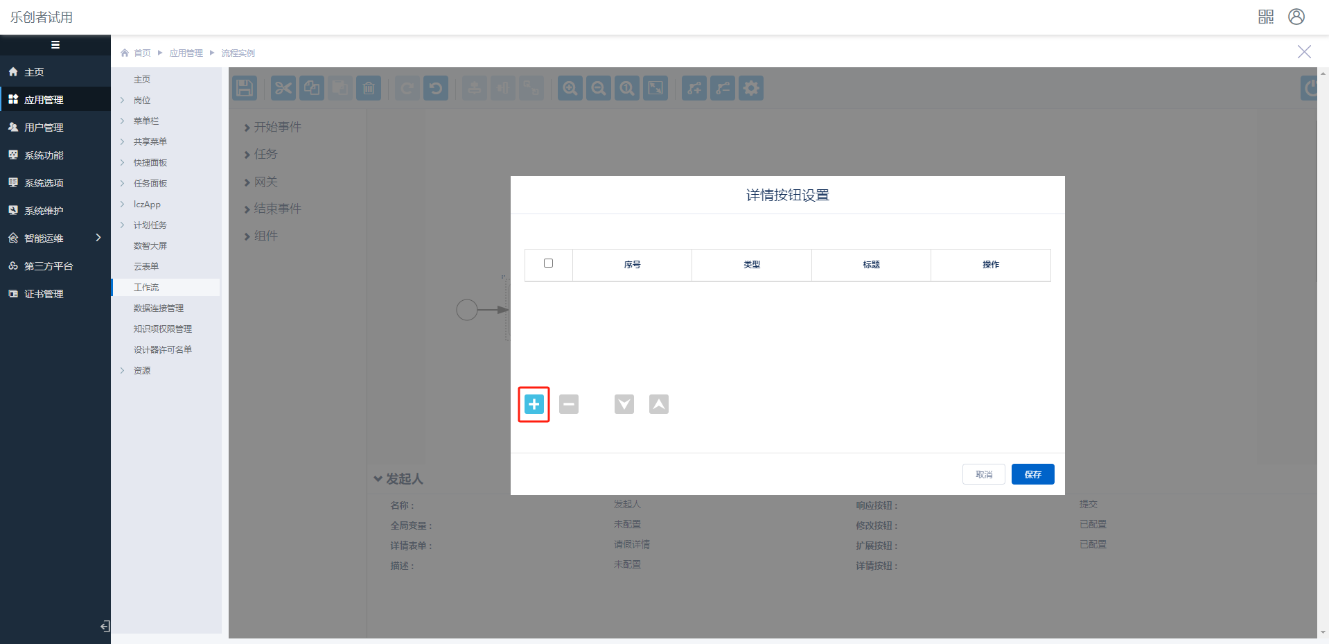 点击【详情按钮】进入下级配置界面【详情按钮设置】,默认列表为空,单击【+】按钮添加详情操作按钮。