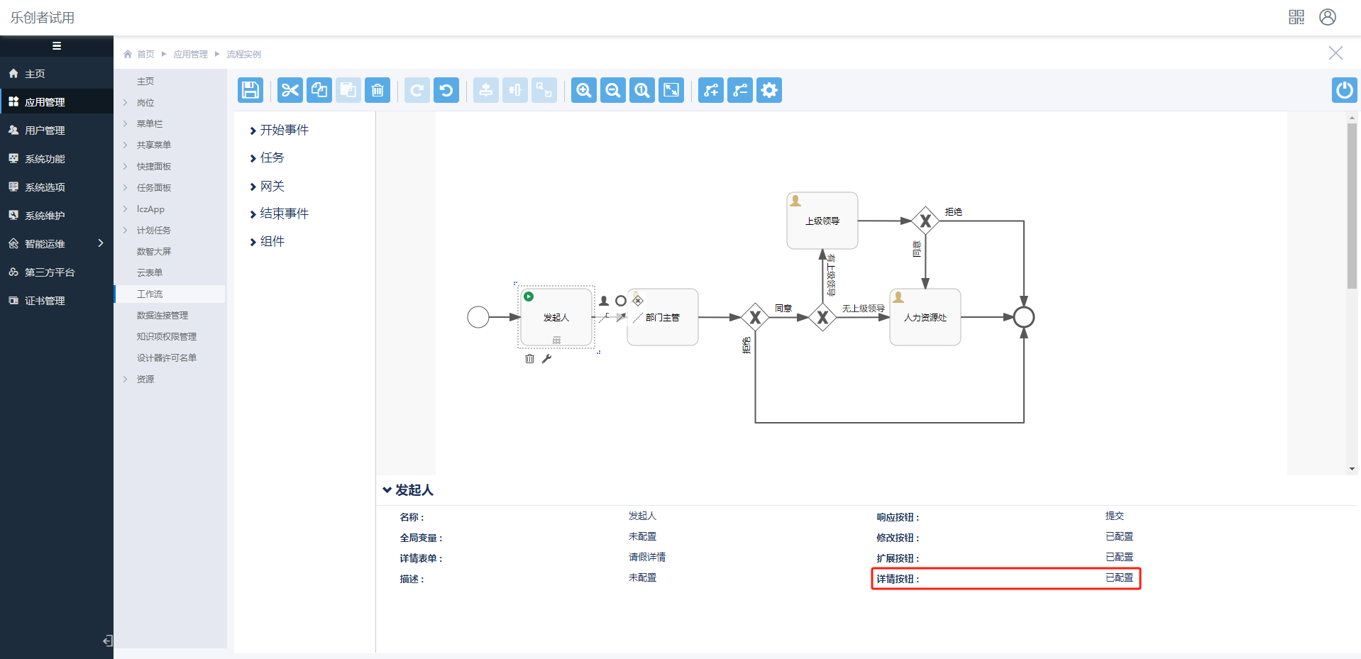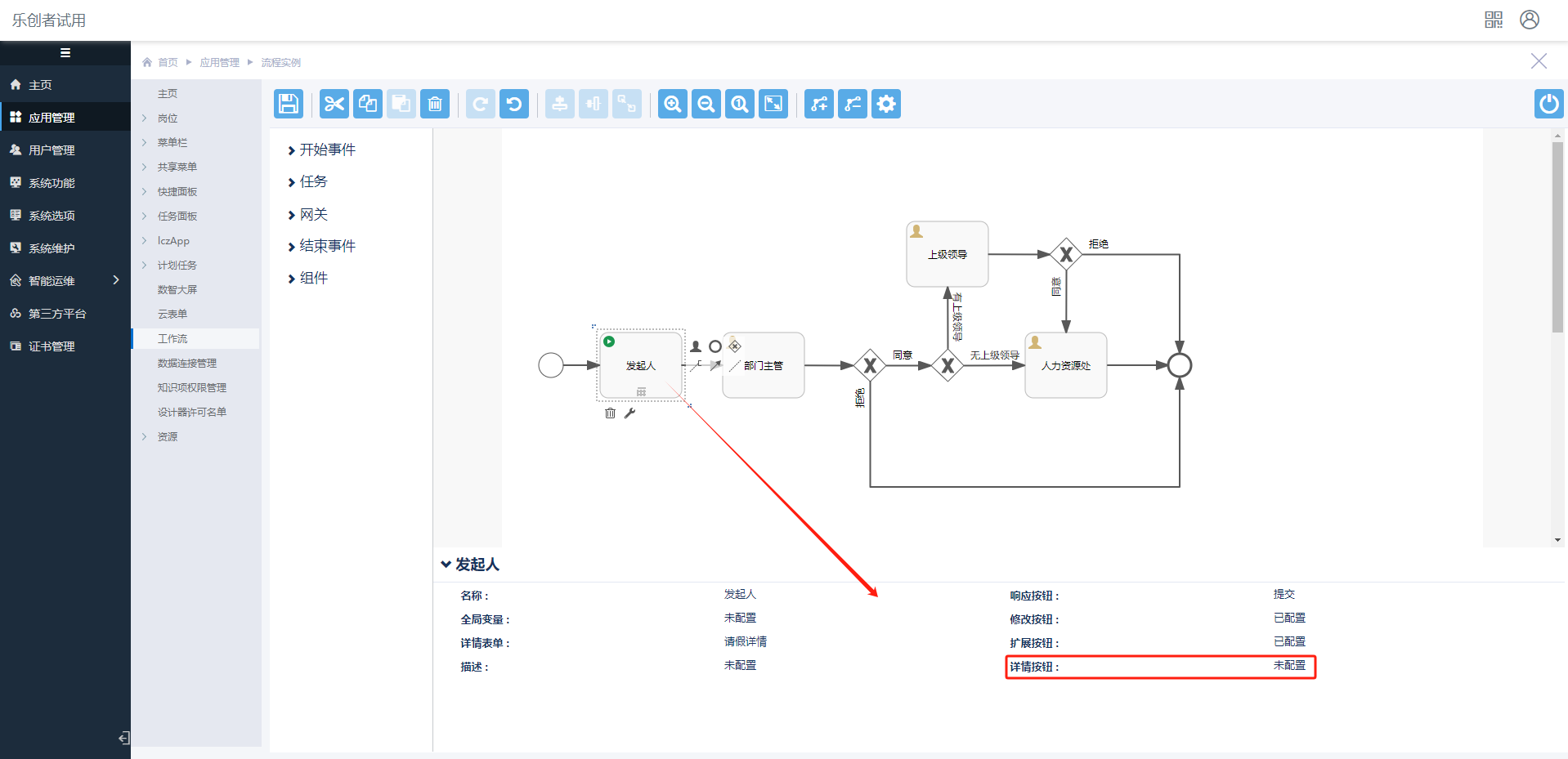 以发起人任务配置界面为例,节点配置界面允许配置【详情按钮】(”撤回”需要在“我的流程”详情查看页面操作),初始状态下为“未配置”,如下图所示: