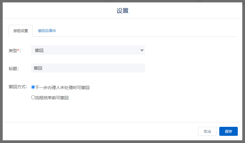 点击【设置】进入按钮设置界面,目前这里仅支持选择“撤回”这一操作,按钮默认标题为“撤回”,支持配置【撤回后事件】。发起人任务额外允许配置【撤回方式】如下图所示,当希望发起人在流程结束前一律可以撤回流程时可以选择勾选“流程结束前可撤回”。