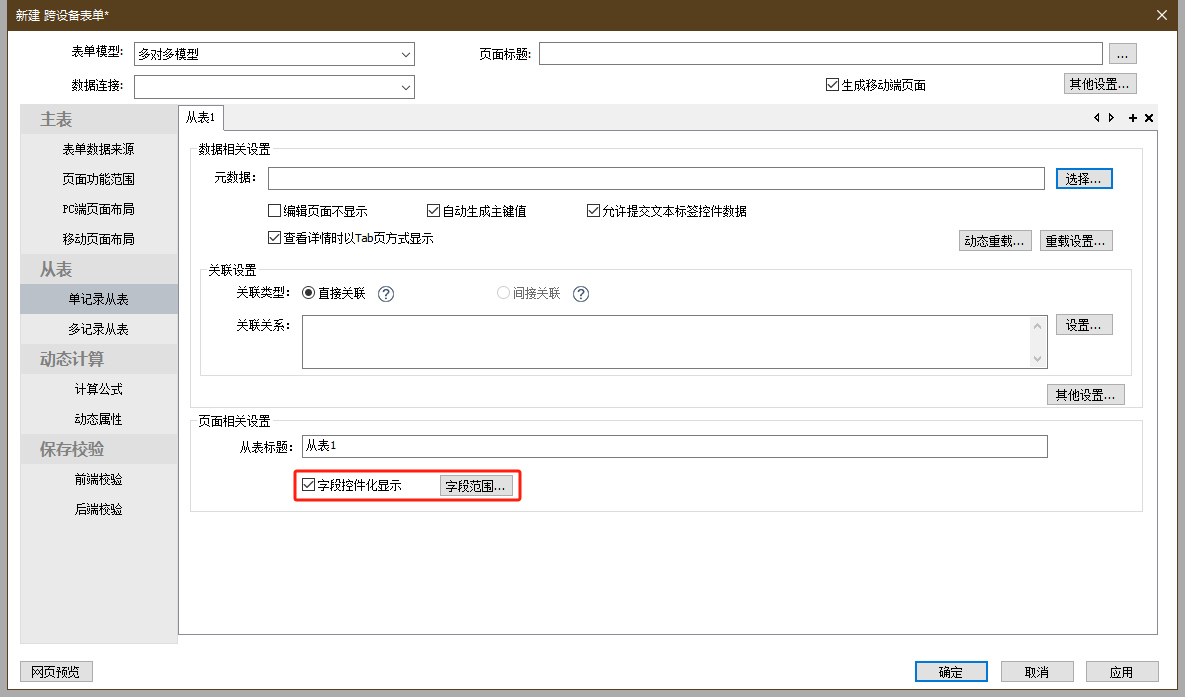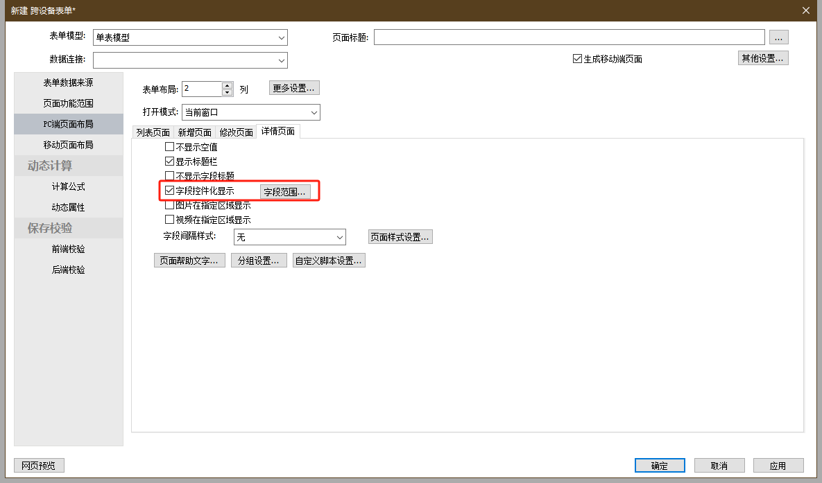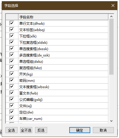 点击【字段范围】,打开如下弹窗,默认全选,可以在这里剔除不需要控件化展示的控件,剔除的控件仍旧以label方式展示。