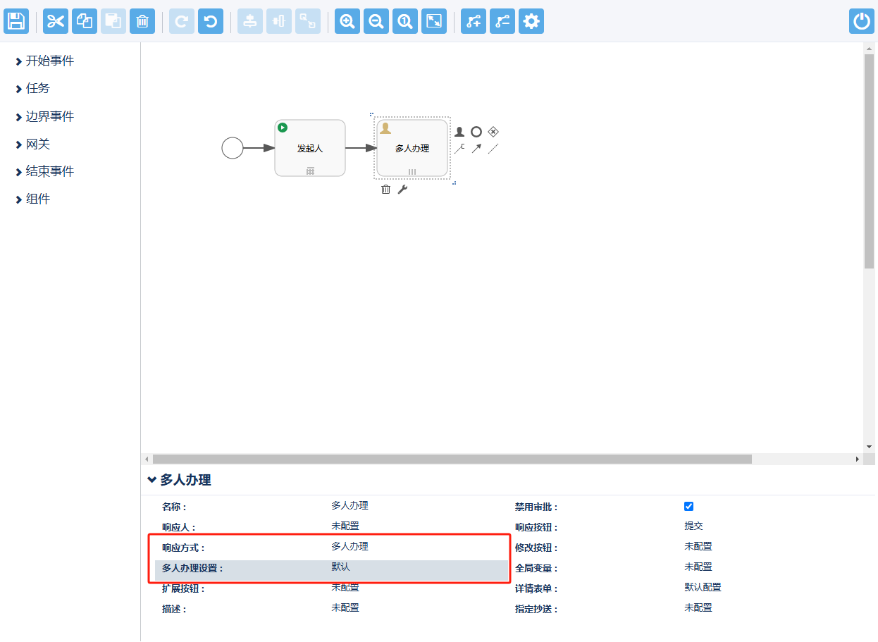注意:V7.1.0及以后的版本中对用户任务的【响应方式】做了如下调整:原来的“竞争响应”调整为“单人办理”,原来的“全部响应”调整为“多人办理”,并且原有的需要所有响应人办理完成后节点才向下流转的响应方式仅作为“多人办理”中的默认任务完成条件。