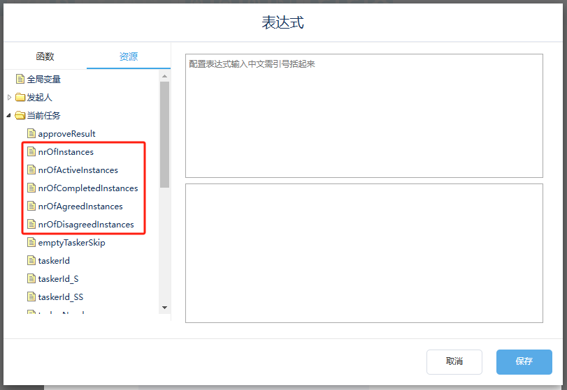 在表达式编辑器中扩充了当前任务办理情况相关的变量,如下图所示: