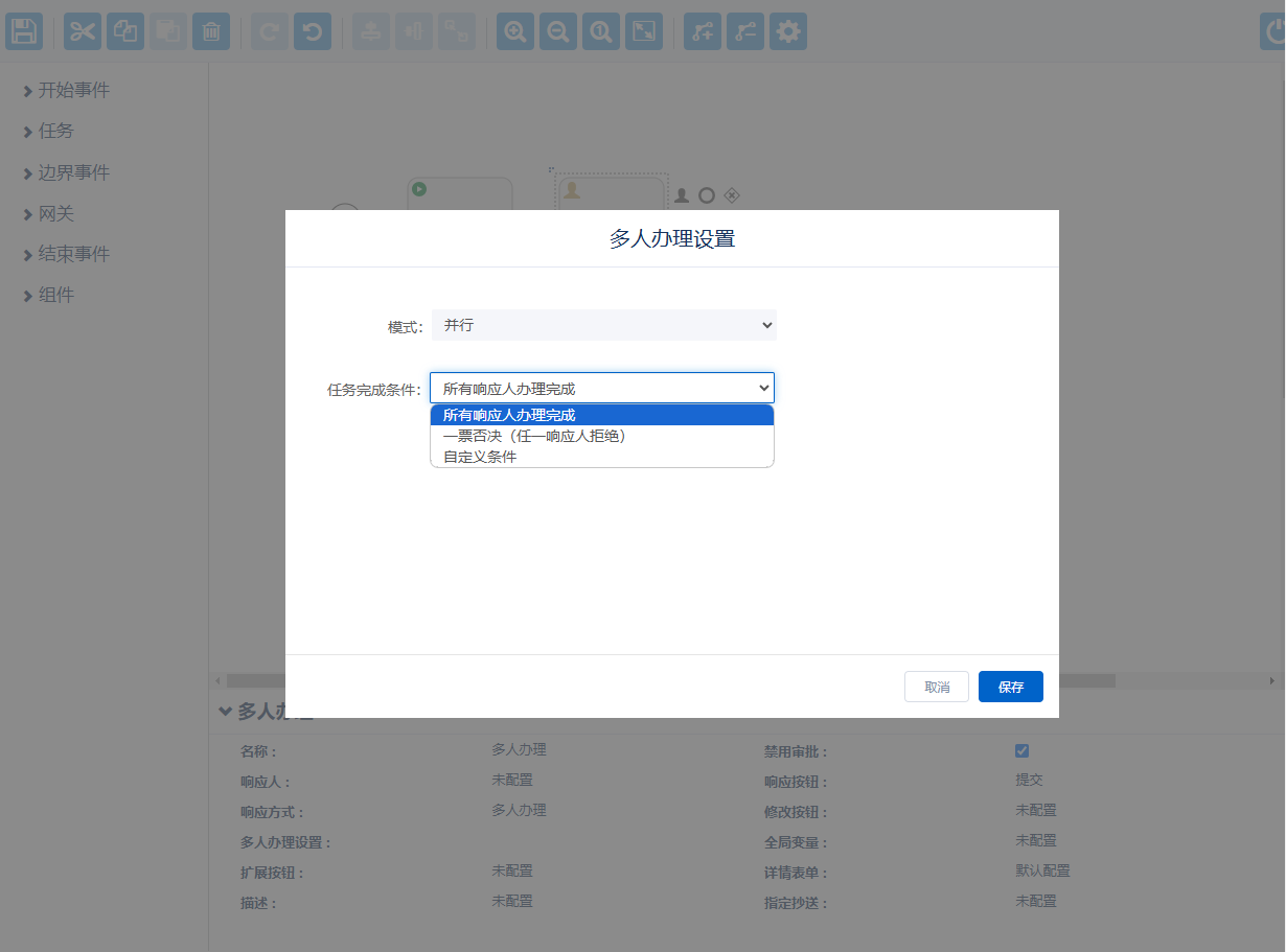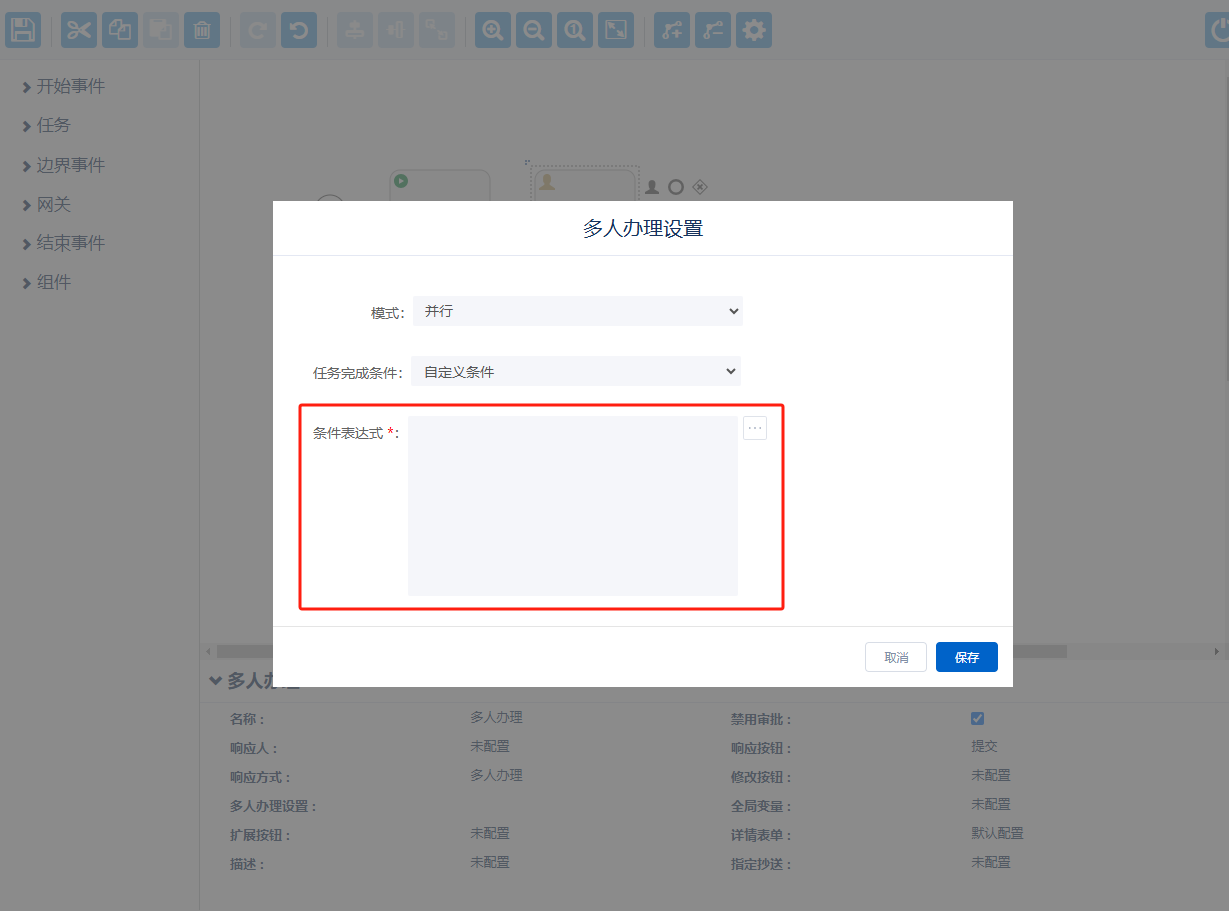 以上是两种常见业务,可以直接通过选项选择使用,如若还有其他多人办理的业务需要实现可以选择自定义完成条件的方式进行配置,如下图所示可以在条件输入框中输入条件表达式。