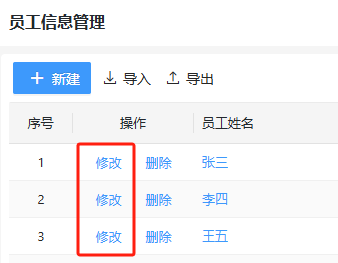 列表页面系统操作,显示在数据行上,可以跳转表单修改页面进行数据修改。